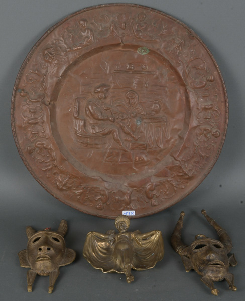 - Katalog-Nr: 1297Viertlgs. Konvolut Metall: Zwei Narrenmasken, eine Schale mit Damenfigur und ein Wandteller, reliefiert mit Genreszene, B=12 bis 43 cm.o.L.