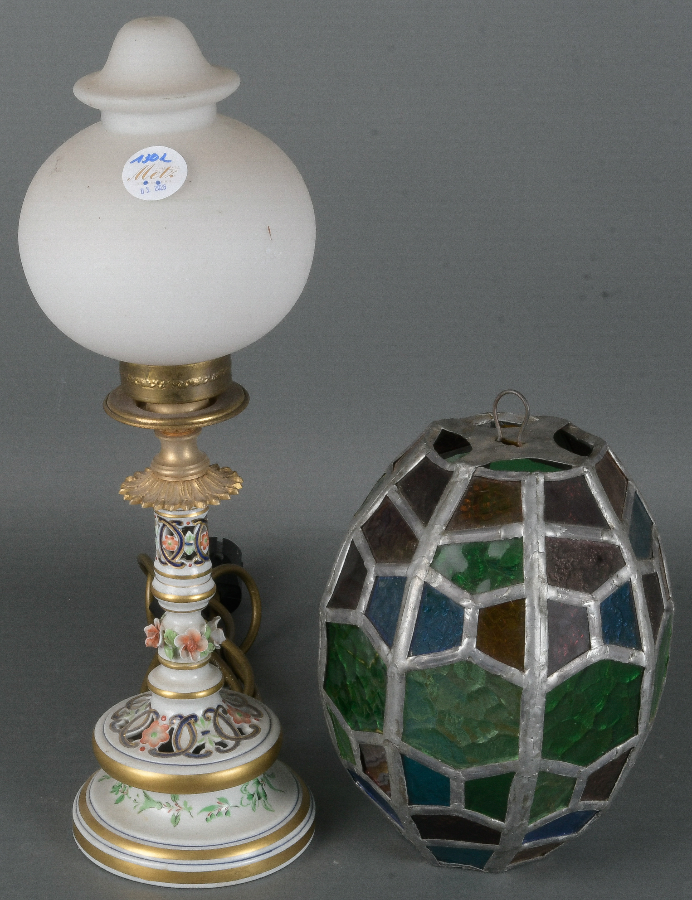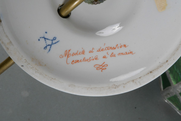 - Katalog-Nr: 1302Tischlampe. Frankreich 20. Jh. Porzellan, bunt bemalt; am Boden gemarkt; dazu bleiverglaster Lampenschirm, H=44 / 23 cm. (Funktion ungeprüft)o.L.