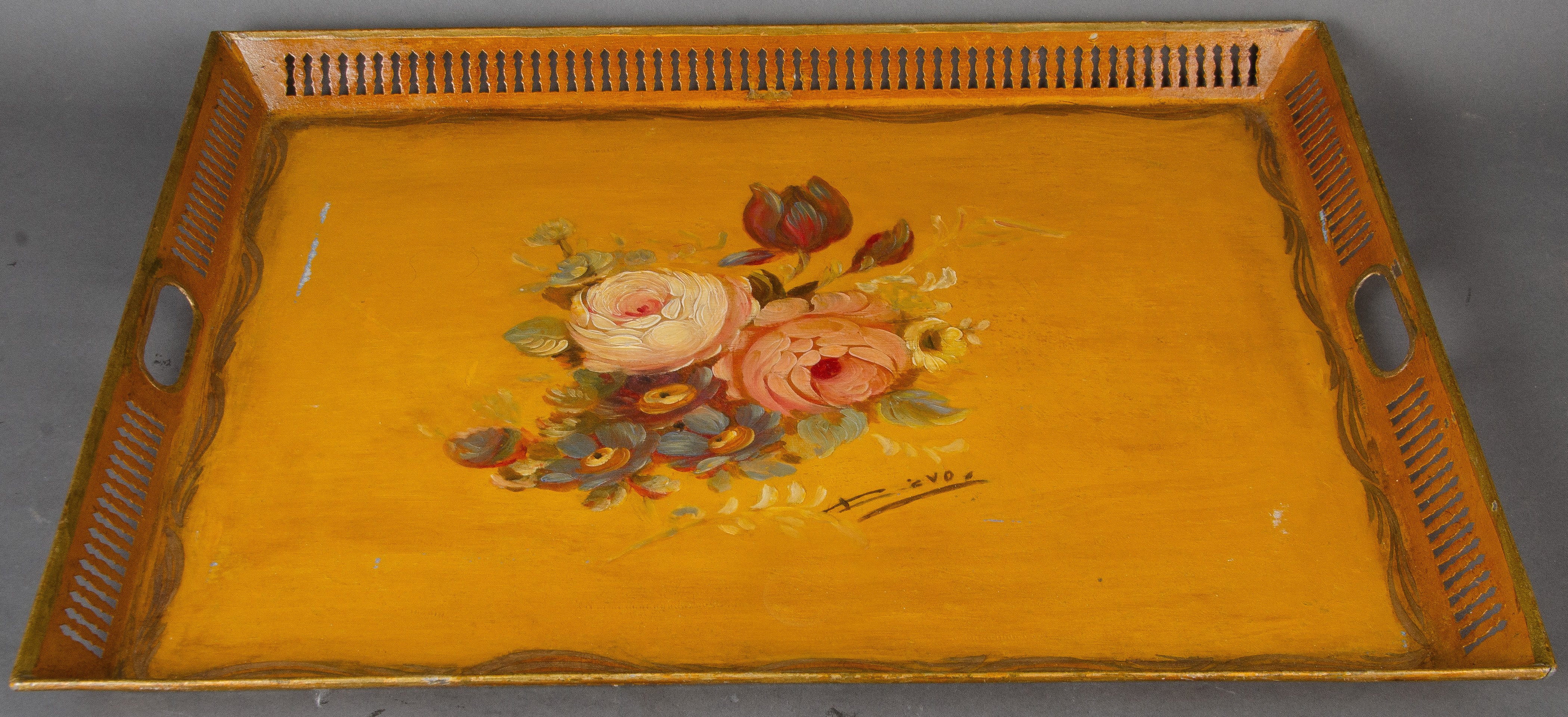 - Katalog-Nr: 1313Serviertablett. Italien um 1900. Blech, senffarben lackiert und bunt floral bemalt, re./u. unleserlich sign., H=3,3 cm, B=50,5 cm, T=40 cm.o.L.