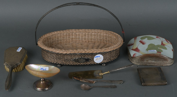 - Katalog-Nr: 1306Konvolut Silber, ca. 340 g, und Versilbertes: Henkelkörbchen mit Basteinsatz (H=20 cm, B=28 cm, T=16 cm), Besteckteile, Haarbürsten, Fußschale und Zigarettenetui.o.L.