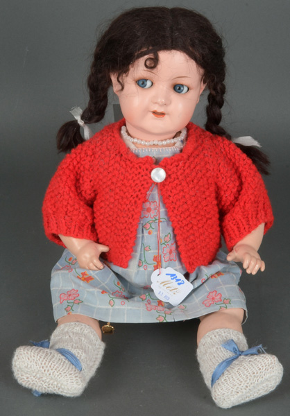 - Katalog-Nr: 1318Puppe. Deutsch 20. Jh. Mit Schlafaugen, offenem Mund und Celluloidgliedern, H=43 cm.o.L.