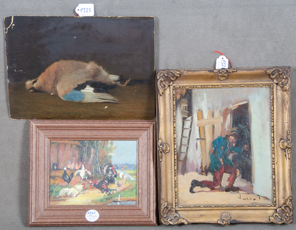 - Katalog-Nr: 1323Ernst Zimmermann (1852-1901). Eichelhäher. Öl/Malkarton, verso bez./dat. „Hanau 1888“; dazu Maler des 20. Jhs. Hühner im Hof / Der Hühnerdieb. Öl/Holz bzw. Malkarton, teilw. gerahmt, 14,5 x 20 bis 26,5 x 21 cm. (eines besch.)o.L.