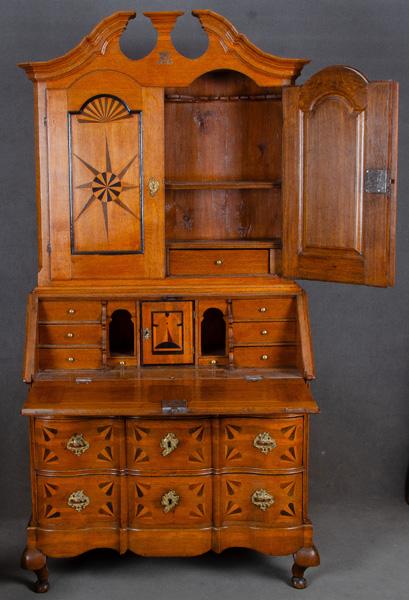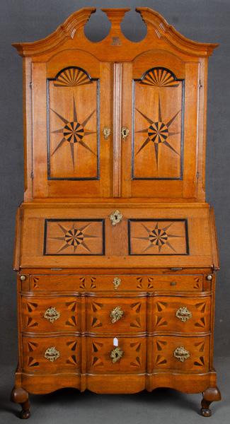 - Katalog-Nr: 1324Aufsatzschreibkommode. Hessen um 1760. Jh. Massiv Eiche, teilw. ebonisiert, intarsiert mit Sterndekor und Fächermuster, vergoldete Bronzebeschläge mit Rocaillen und Voluten; geschweifte Füße, dreischübig, gewellte Front, gerade Seiten, hinter Schreibklappe acht Schübe, zurückgesetzter Aufsatz mit zwei Türen, dahinter zwei Schübe, profilierter Zangenkopfgiebel, H=200 cm, B=100 cm, T=50 cm.o.L.