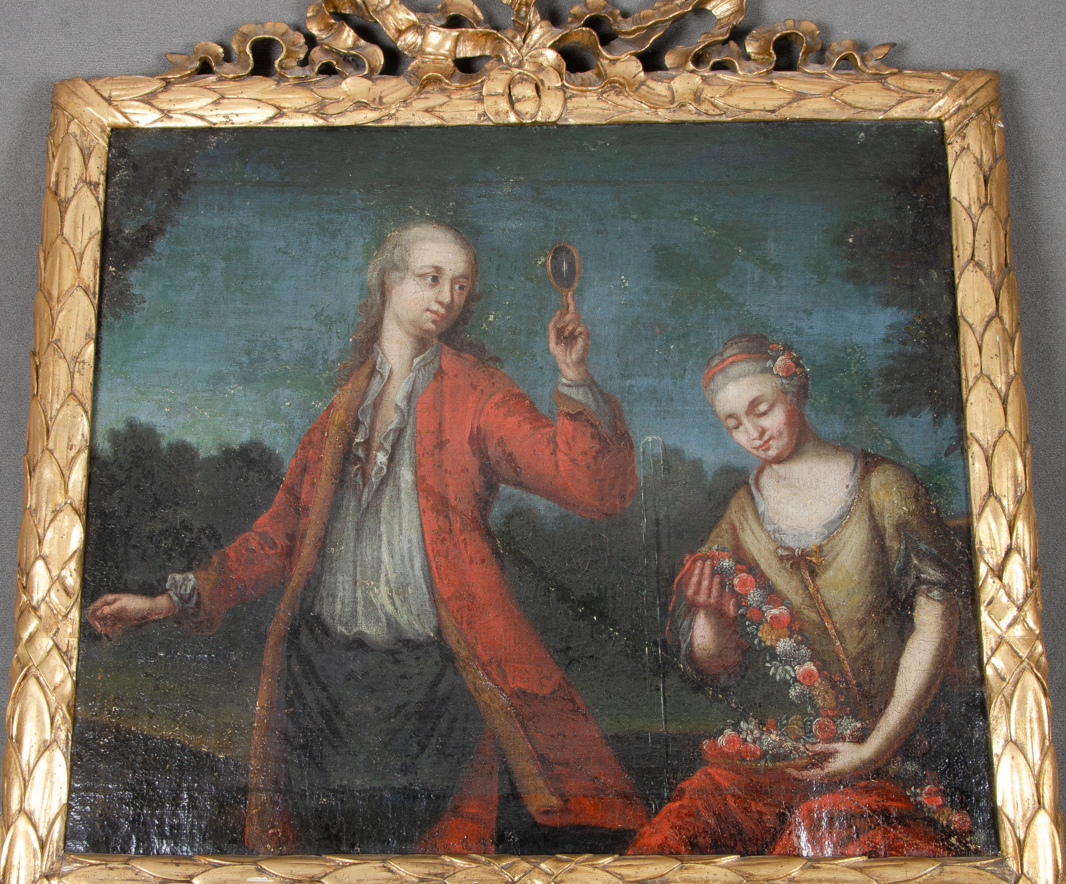 - Katalog-Nr: 1326Trumeau-Spiegel. Frankreich 18. Jh. Massivholz, auf Kreidegrund gold gefasst, dekoriert mit Blättern und Schleifen, im Trumeaufeld bunt bemalt mit figürlicher Szene eines Jünglings mit Spiegel und Dame mit Blumen, 203 x 73 cm. (rest.)o.L.