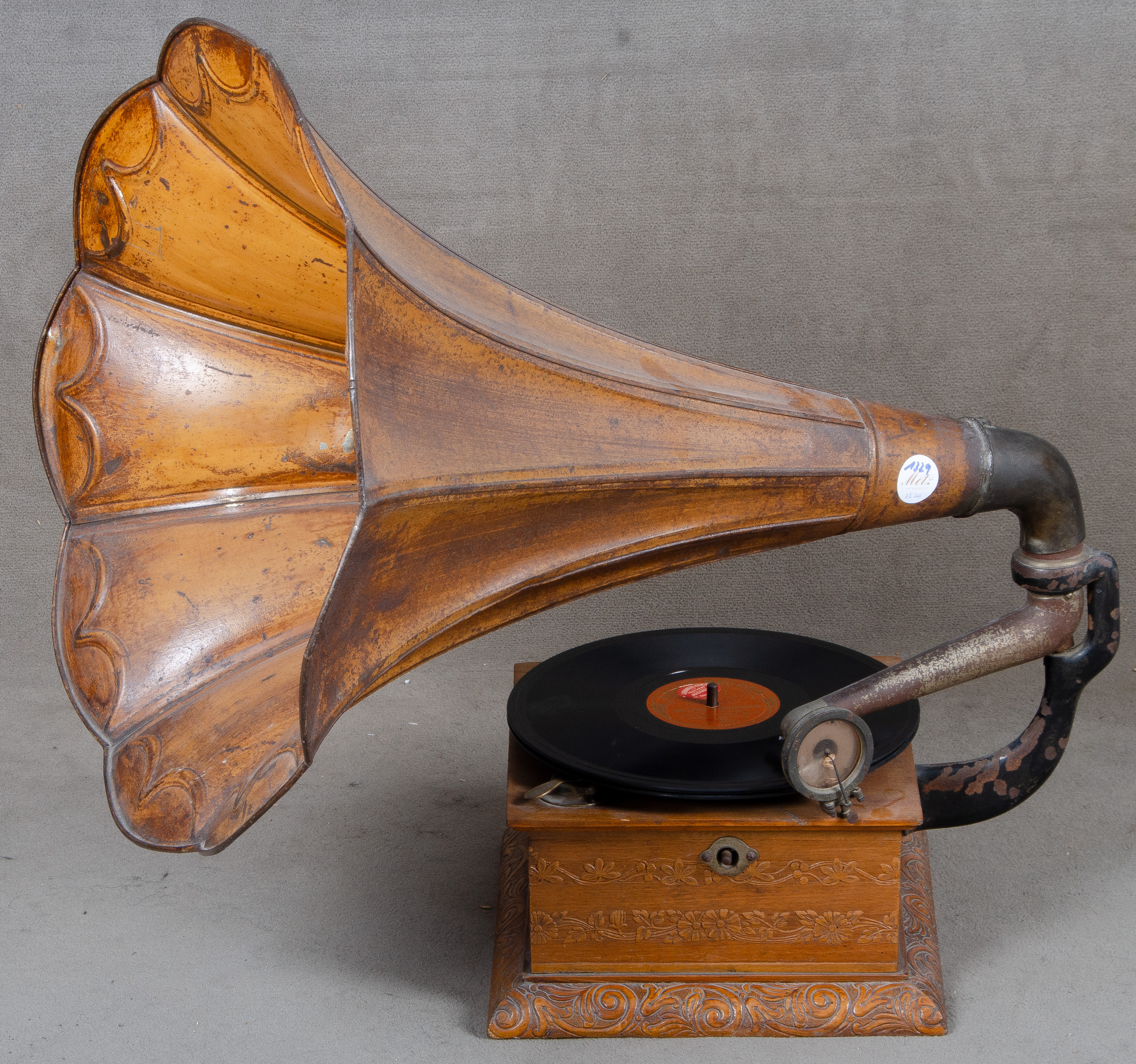 - Katalog-Nr: 1329Trichter-Grammophon mit drei Shellack-Platten und Reform-Schalldose, Holzkasten mit Metallvorrichtung, H=67 cm. (Funktion ungeprüft)o.L.
