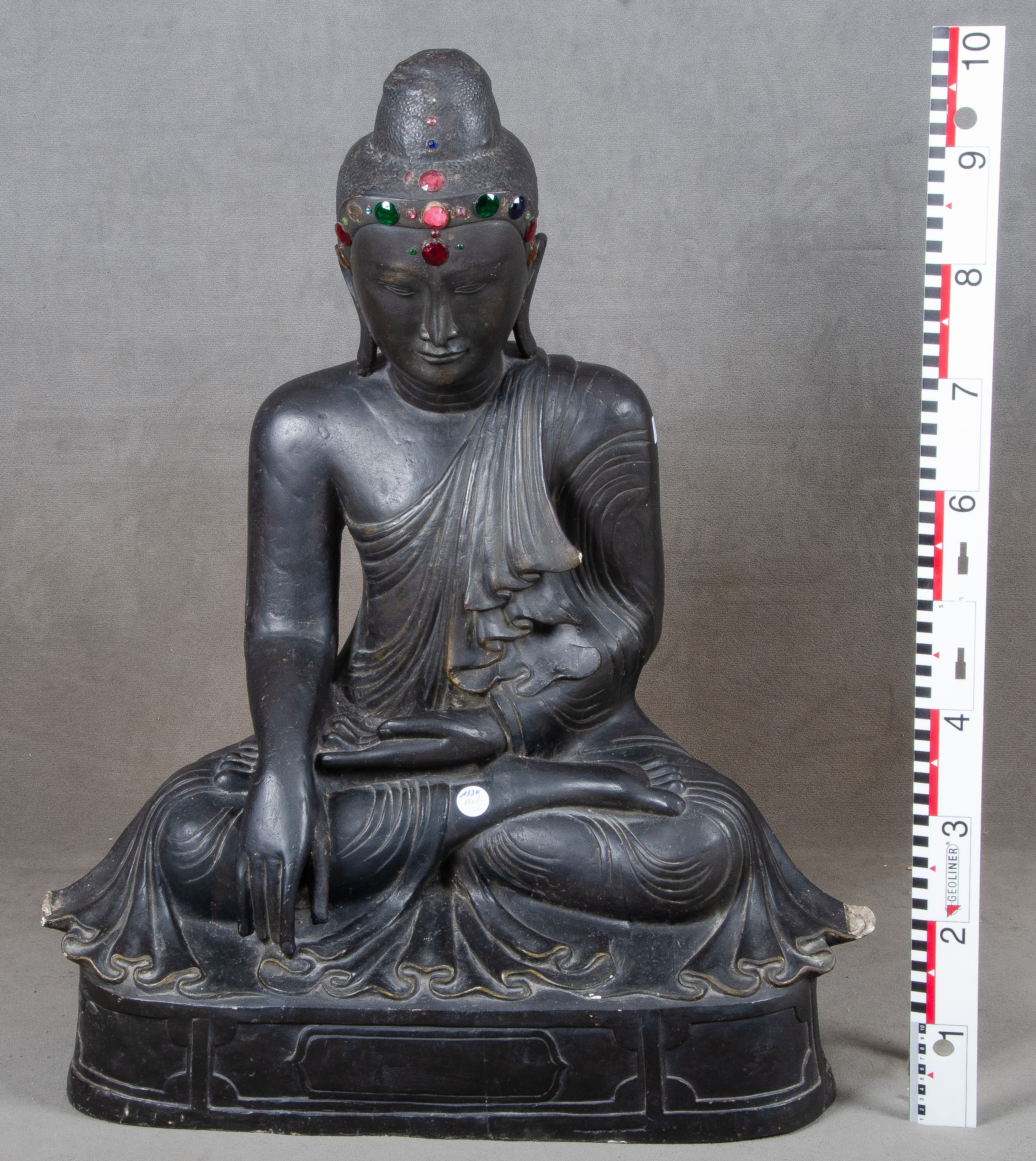 - Katalog-Nr: 1330Sitzender Buddha. Asien. Kunstmasse, besetzt mit Farbsteinen, H=100 cm. (besch.)o.L.