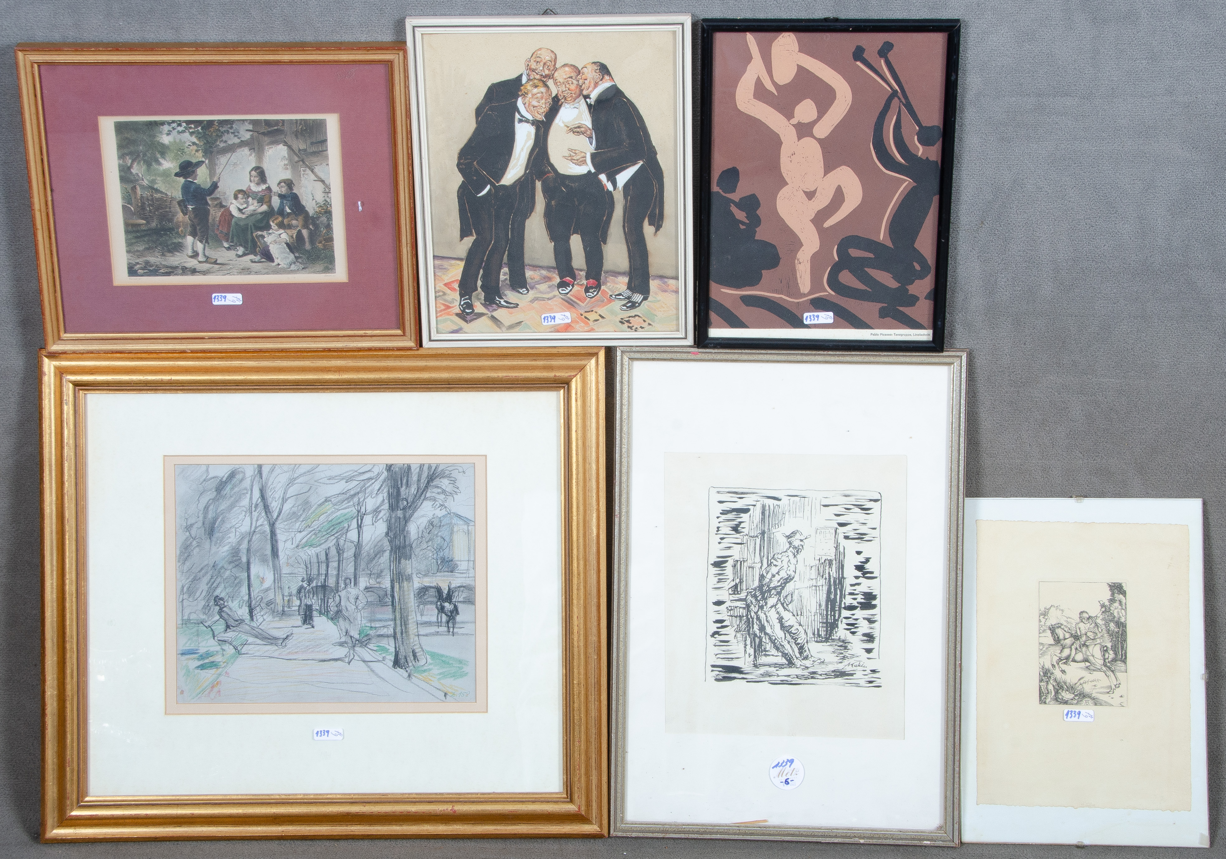 - Katalog-Nr: 1339Sechstlgs. Konvolut: Alfred Kubin (1877-1959). Soldat. Lithographie, re./u. in der Platte sign., verso bez., mit Passepartout hi./Gl. gerahmt (18 x 15 cm); Graphiker des 20. Jhs. Parkpromenade mit Personenstaffage und Gebäuden. Mixed Media, re./u./bez. „Z1D8“, mit Passepartout hi./Gl. gerahmt (21,5 x 26,5 cm); drei unterschiedliche Rahmen (30 x 21 bis 29 x 22 cm) und ein Druck.o.L.