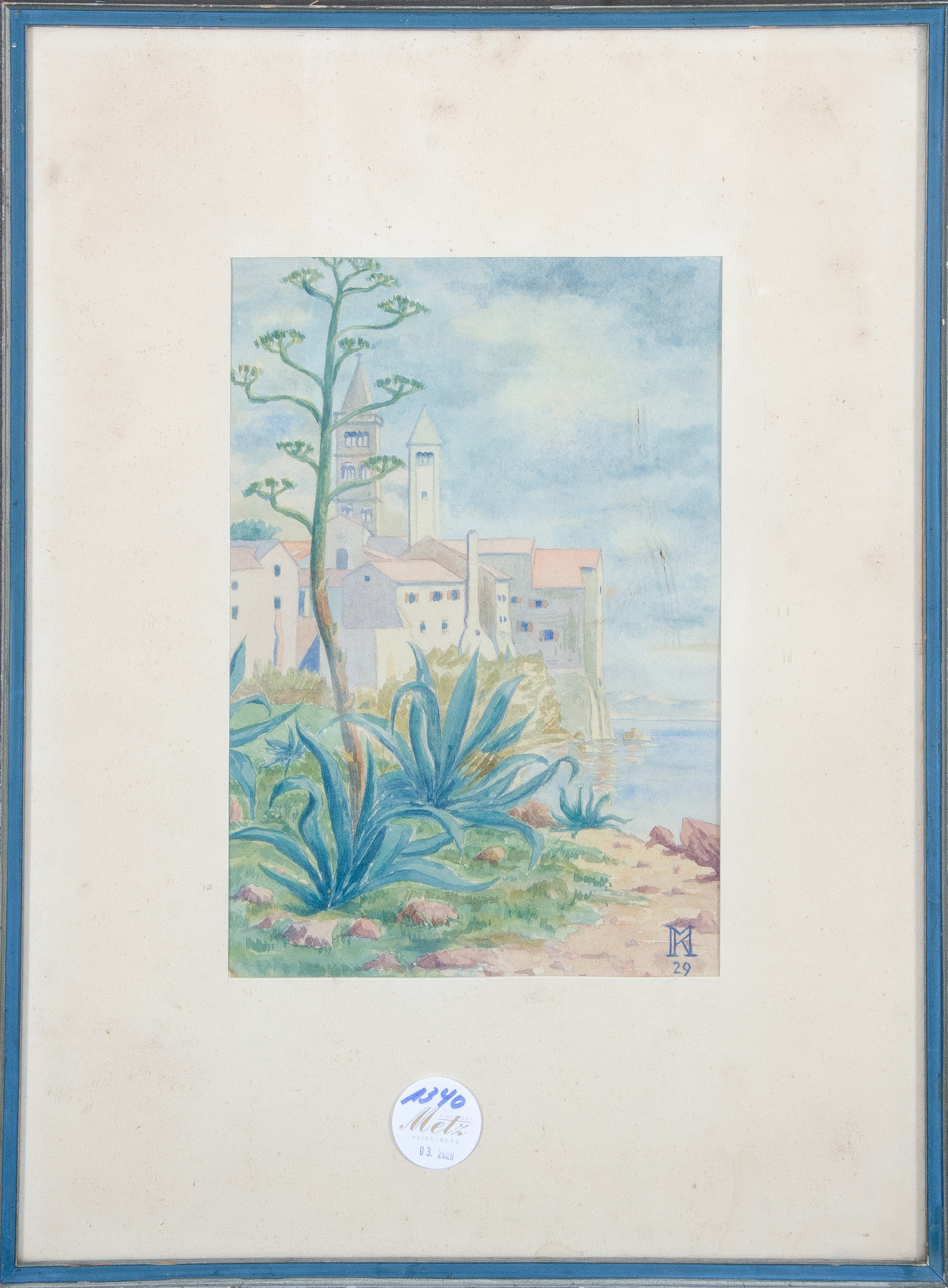 - Katalog-Nr: 1340Maler des 20. Jhs. „Agaven am Strand“. Aquarell/Papier, re./u./monogr./dat. (19)29, mit Passepartout hi./Gl. gerahmt, 23,5 x 16,5 cm.o.L.