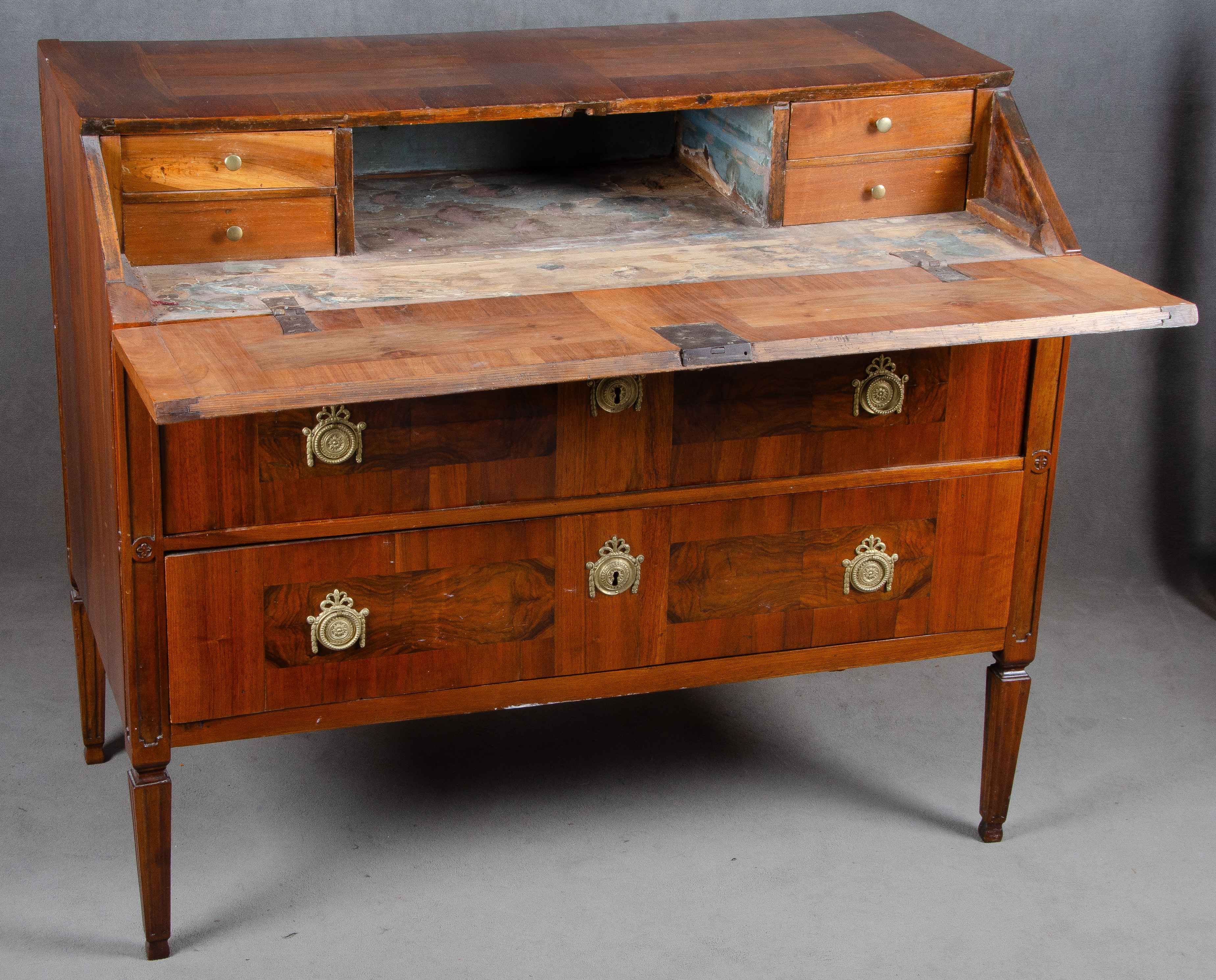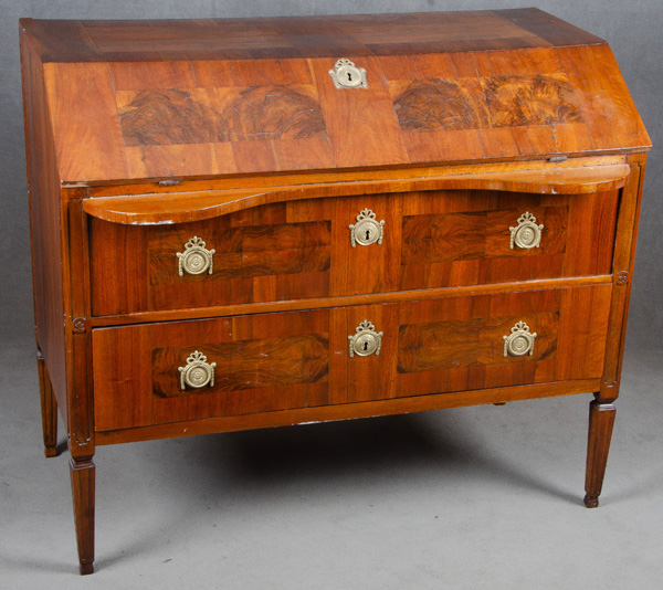 - Katalog-Nr: 1344Schreibkommode. Deutsch 19. Jh. Nussbaum furniert, teilw. massiv und geschnitzt, Messingbeschläge; Spitzfüße, zweischübig, Schreibplatte mit Inneneinteilung, gerade Plattenkante, H=99 cm, B=114 cm, T=66 cm. (mit Ergänzungen)o.L.