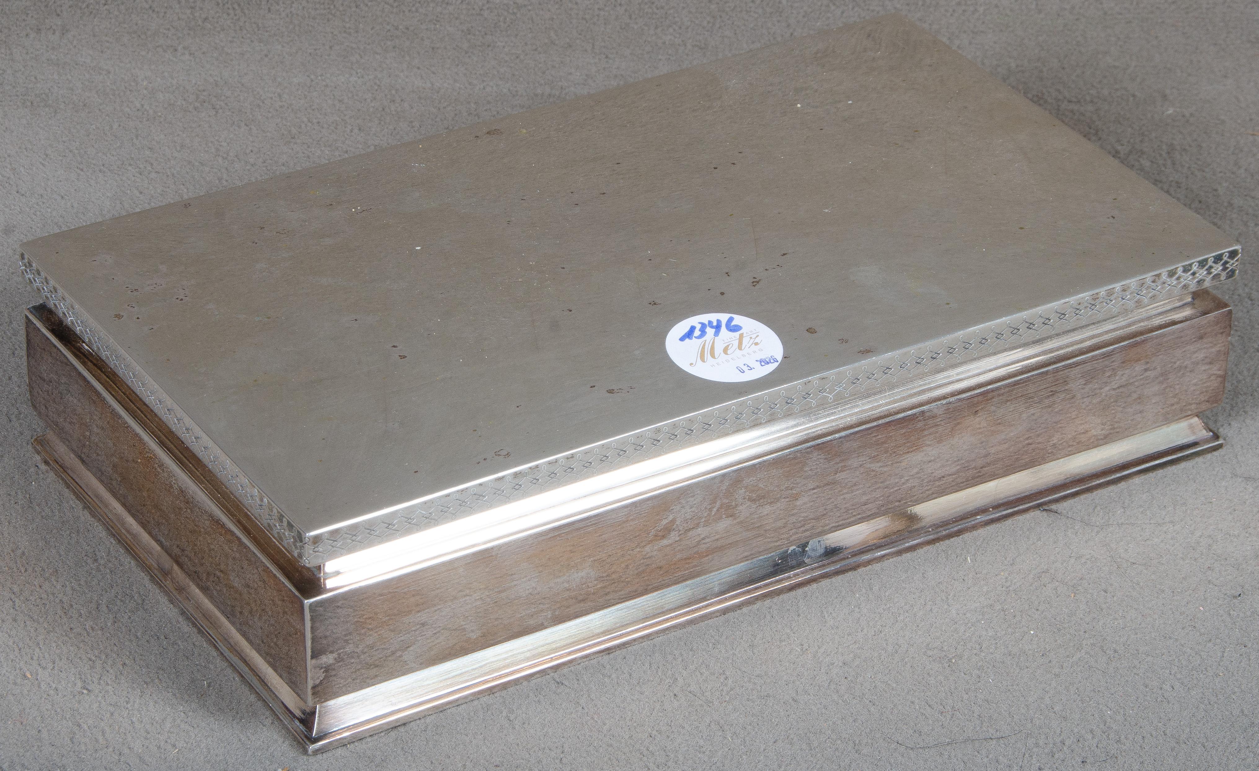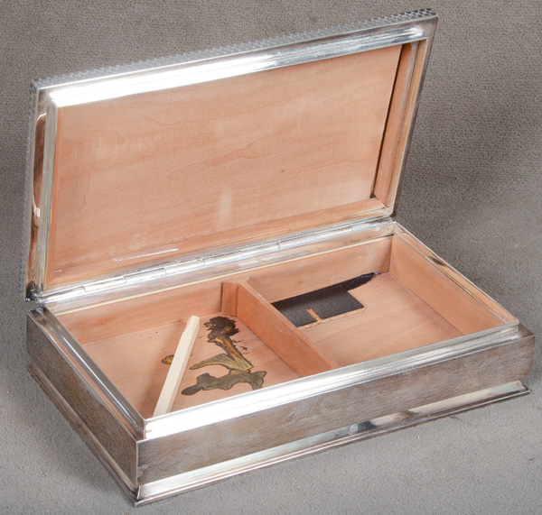 - Katalog-Nr: 1346Zigarrenbox. Deutsch 20. Jh. Silber, innen mit Holzeinteilung, H=6 cm, B=28 cm, T=16 cm.o.L.