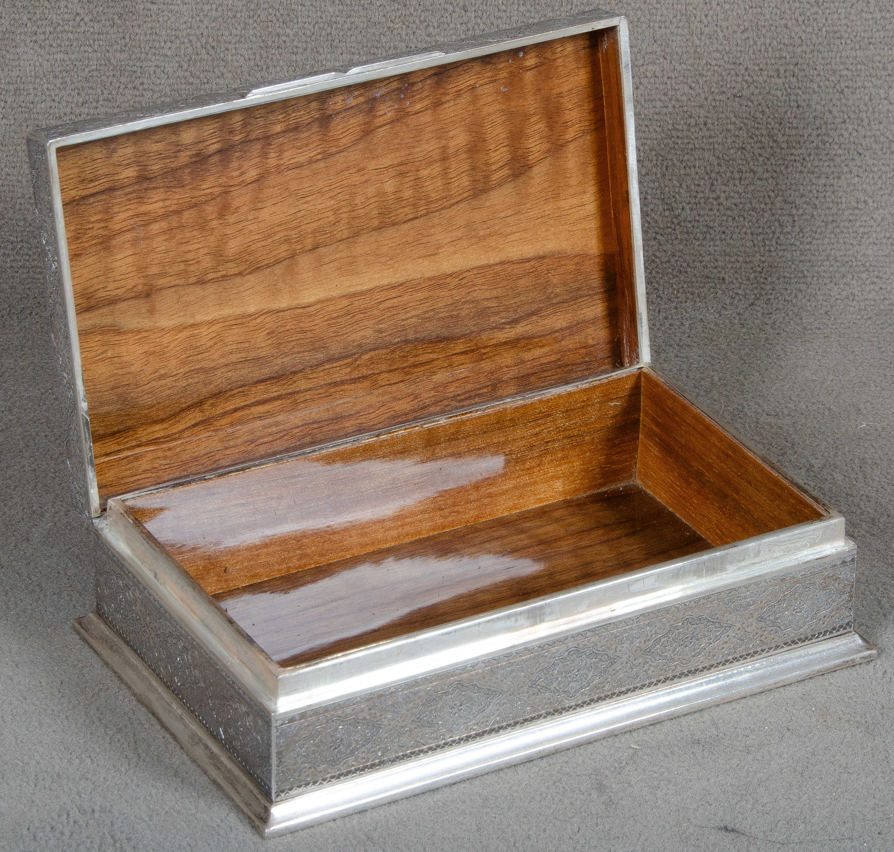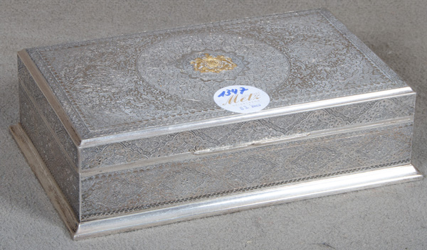 - Katalog-Nr: 1347Zigarettenbox. Holzkorpus mit Silberbeschlägen, ziseliert mit orientalischer Ornamentik, mittig das Wappen des Schahs von Persien, H=5,5 cm, B=20 cm, T=12,5 cm.o.L.