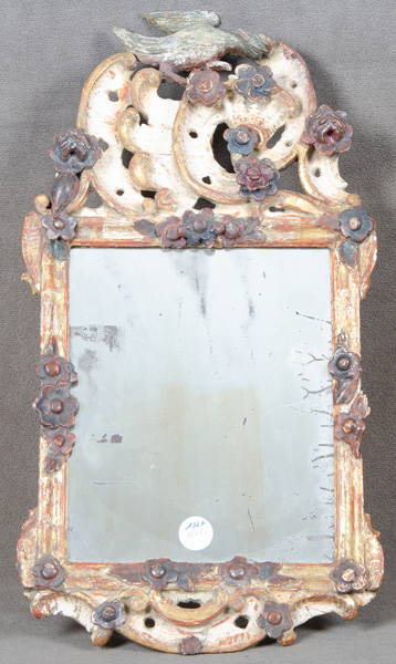 - Katalog-Nr: 1327Barock-Spiegel. Bayreuth um 1750. Massivholz, durchbrochen geschnitzt, auf Kreidegrund farbig und gold gefasst, dekoriert mit Blüten, Rocaillen und Vogel, 62 x 32 cm.o.L.