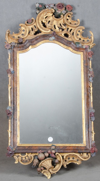 - Katalog-Nr: 1328Barock-Spiegel. Bayreuth um 1750. Massivholz, durchbrochen geschnitzt, auf Kreidegrund farbig und gold gefasst und dekoriert mit Blüten, Rocaillen und Obstkorb, 117 x 61 cm.o.L.