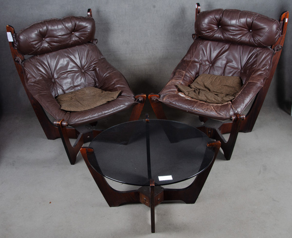- Katalog-Nr: 1333Dreitlge. Designer-Garnitur. Norwegen, Odd Knutsen 1970er Jahre. Bestehend aus: Zwei Sessel „High Back Luna Chair“ und ein Coffee-Cocktail-Table „Luna“ (H=55,5 cm, D=82 cm). Massivholz mit Leder. (Gebrauchsspuren, Leder eines Sessels eingerissen)o.L.