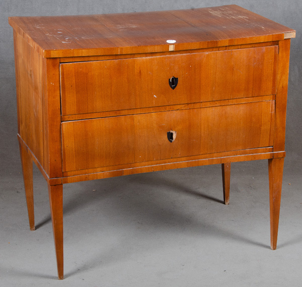 - Katalog-Nr: 1345Biedermeier-Kommode. Deutsch 19. Jh. Kirschbaum furniert, teilw. massiv, mit eingelegten Schlüsselbuchsen; Spitzfüße, zweischübig, überstehende gerade Plattenkante, H=78 cm, B=83 cm, T=48 cm. (mit Ergänzungen)o.L.
