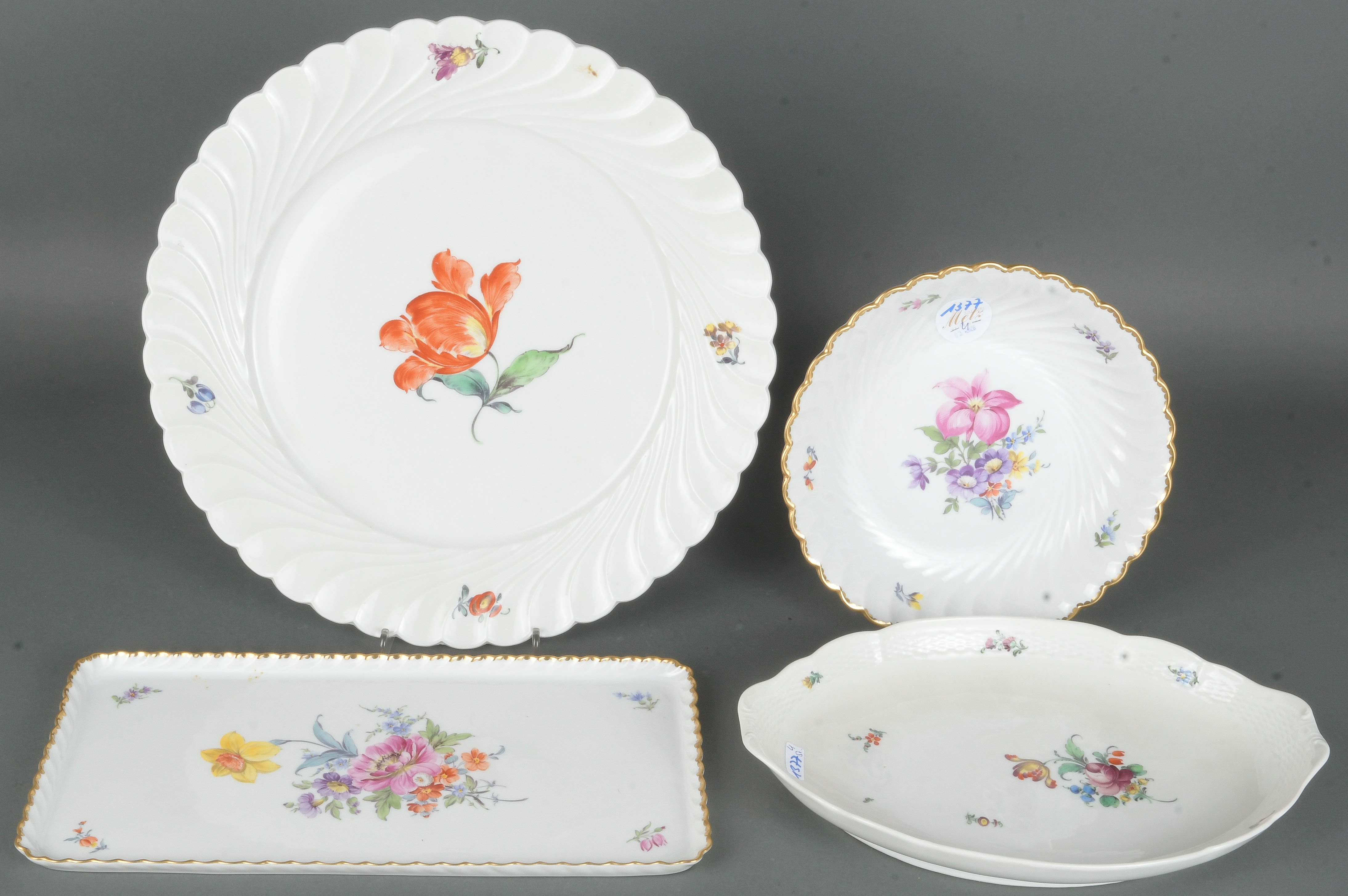 - Katalog-Nr: 1377Viertlgs. Konvolut Nymphenburg 20. Jh. Porzellan, bunt bemalt mit Floraldekor, Goldrand; am Boden eingepresste Rautenschildmarke. Bestehend aus: Eine runde Schale (H=4 cm, D=21 cm), eine ovale Schale (H=4 cm, B=28 cm, T=19 cm), eine rechteckige Kuchenplatte (H=1,5 cm, B=21,5 cm, T=15,5 cm) und eine runde Fächerplatte (D=32 cm).o.L.