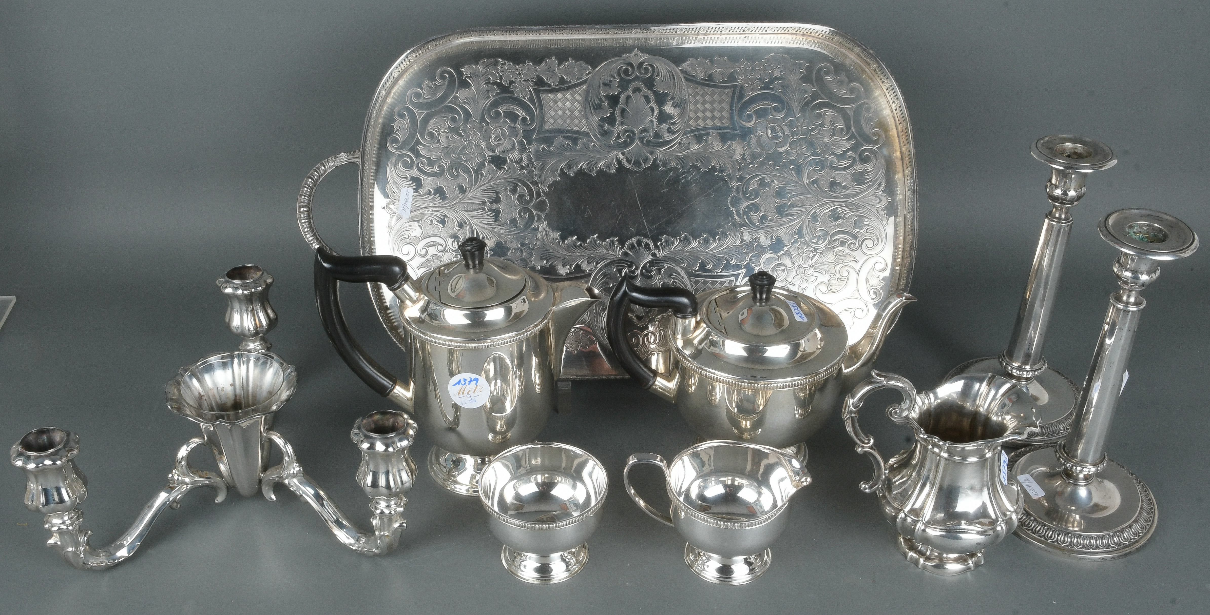 - Katalog-Nr: 1379Neuntlgs. Konvolut: Eine Girandole, 835er Silber, ein Milchgießer, 13-lötiges Silber, zusammen ca. 430 g, sowie Versilbertes: Ein Paar Kerzenständer, zwei Kannen, Milch- und Zuckergefäße und Tablett, H=4,5 bis 24 cm.o.L.
