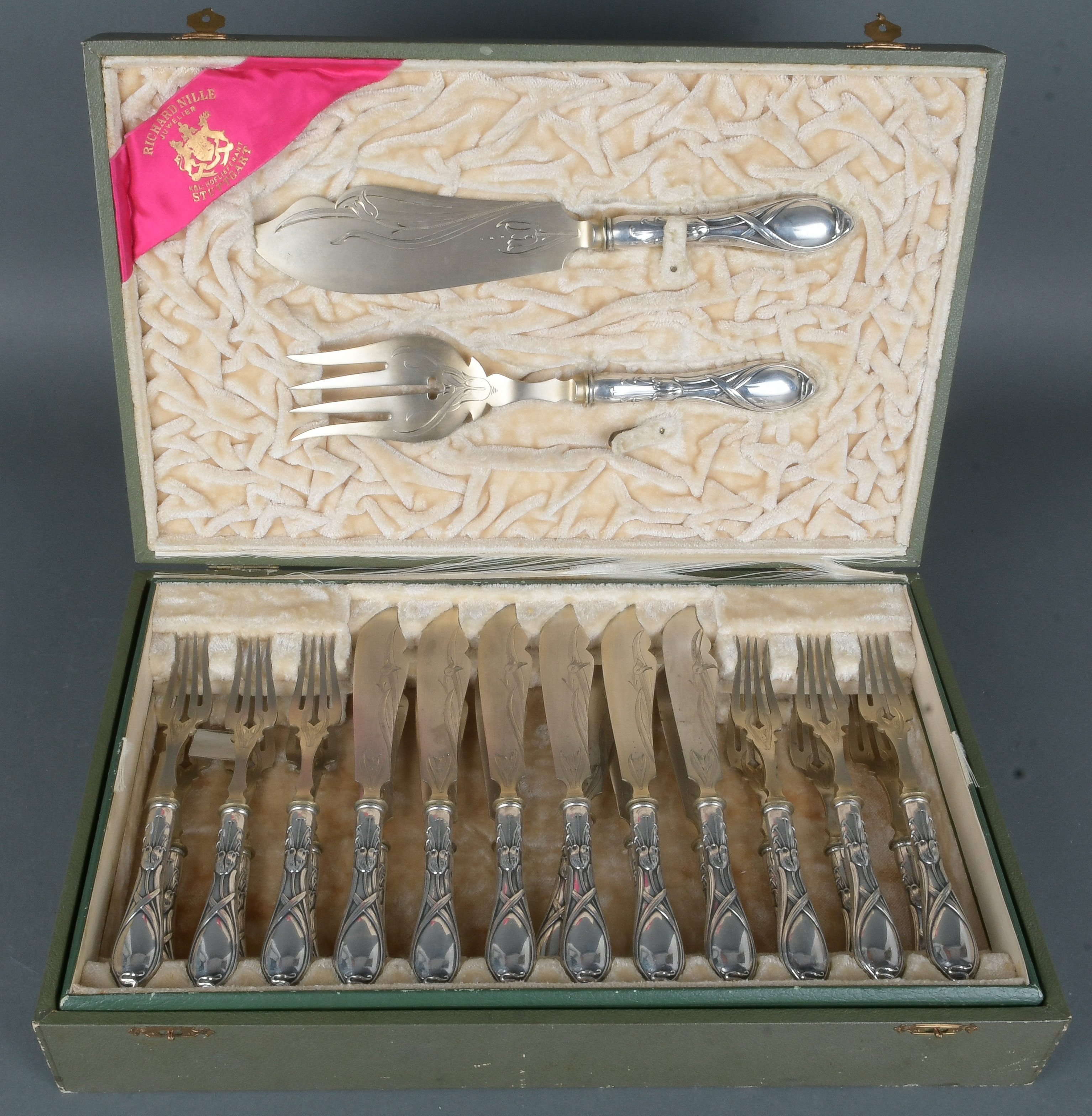 - Katalog-Nr: 138014-tlgs. Jugendstil-Fischbesteck. Stuttgart, Richard Nille um 1900. 800er Silber, mit reliefiertem und ziseliertem Mohnblütendekor. Bestehend aus: Je zwölf Fischmesser und -gabeln und zwei Vorlegeteile, in Original-Besteckkasten.o.L.