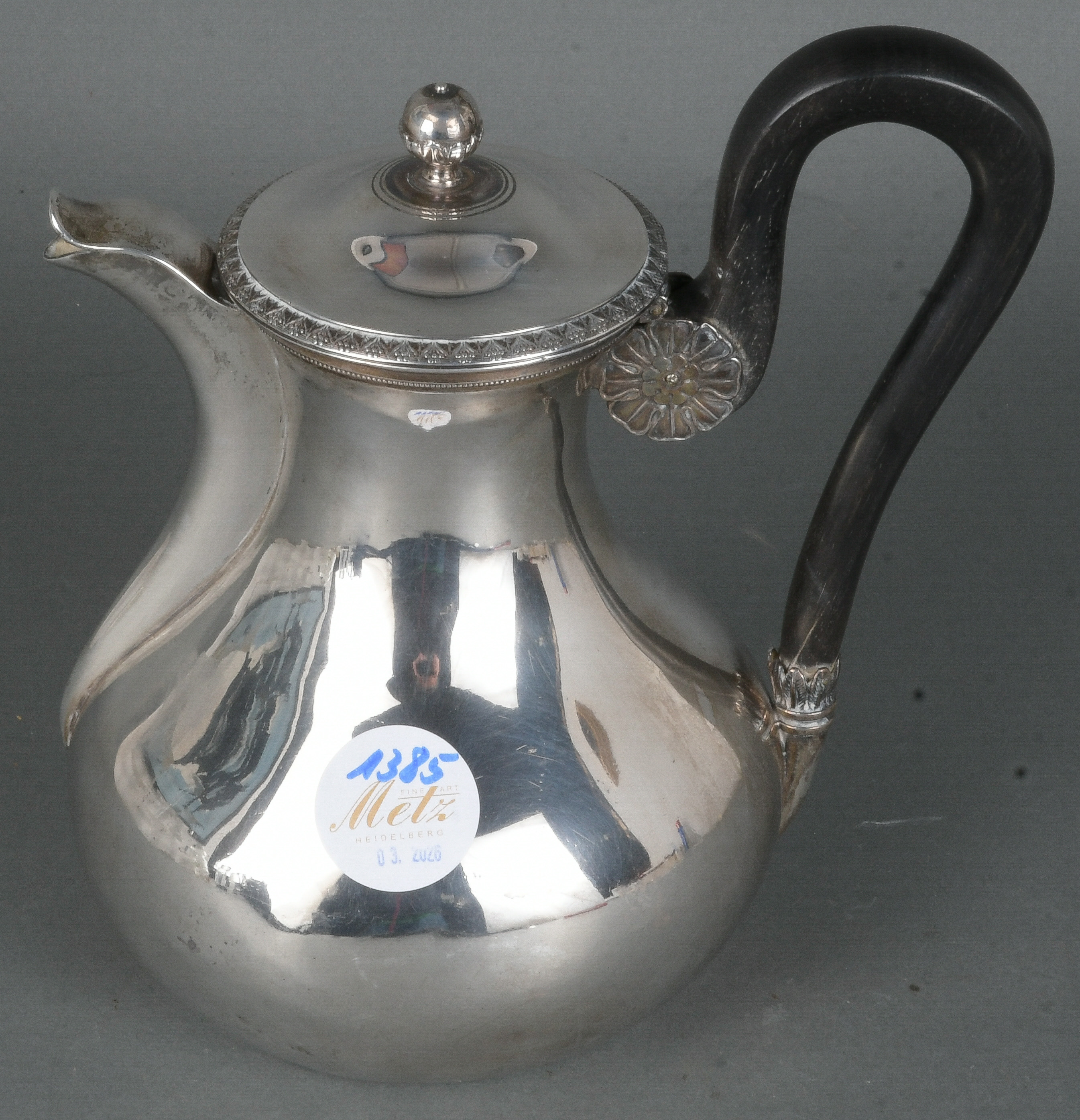 - Katalog-Nr: 1385Kanne. Wohl deutsch 19. Jh. Silber, ca. 600 g, mit Ebenholzhenkel, H=20 cm.o.L.