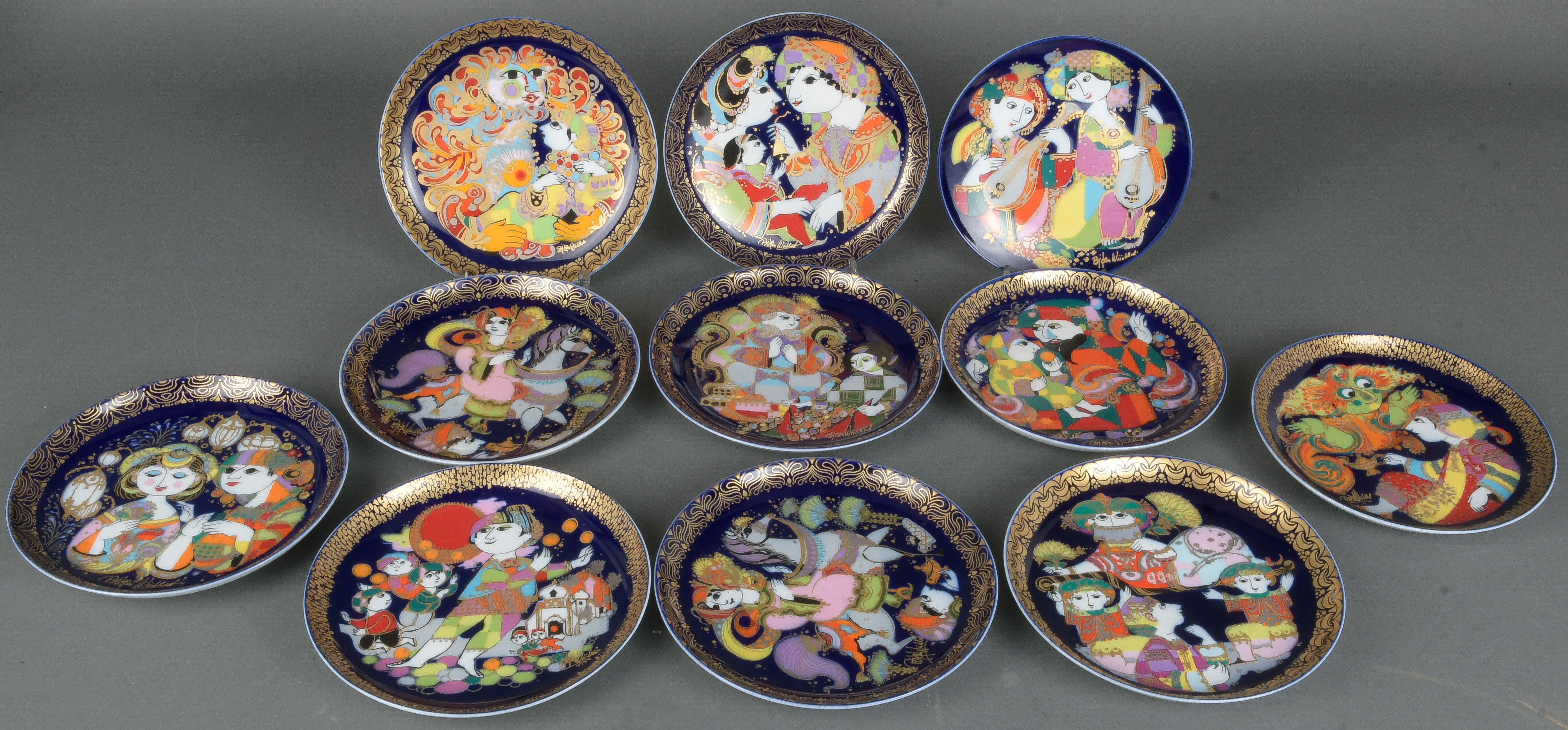 - Katalog-Nr: 1389Elf Wandteller. Rosenthal 20. Jh. Porzellan, bunt bemalt und gold überdekoriert mit Motiven aus „Aladin und die Wunderlampe“ (zehn Stück) und „Orientalische Nachtmusik“ (ein Stück), Entwurf und sign. Björn Wiinblad, D=15,5 / 16 cm.o.L.