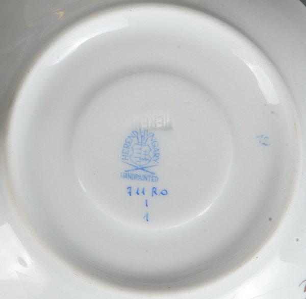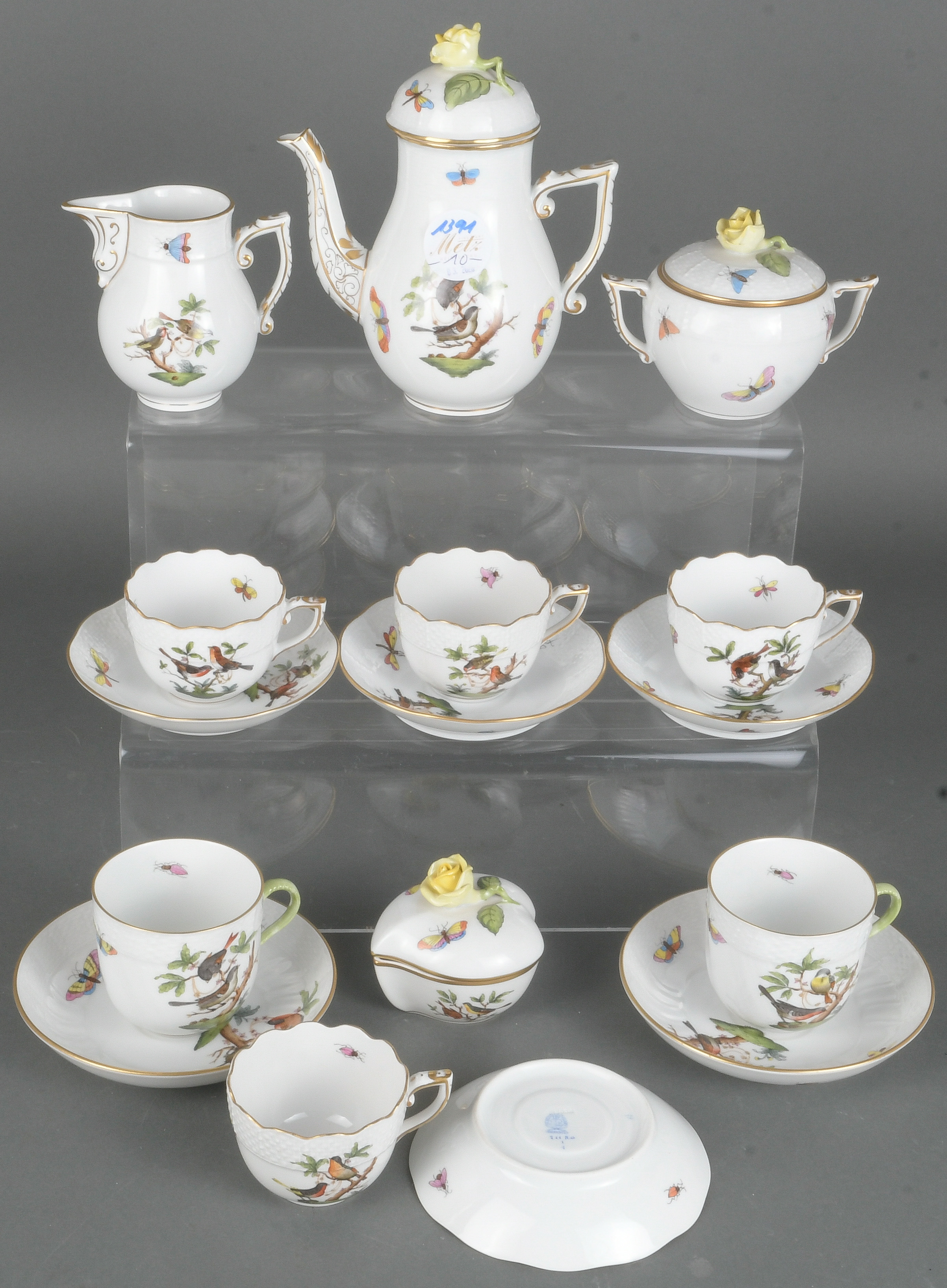 - Katalog-Nr: 1391Zehntlgs. Service „Rothschilddekor“. Herend 20. Jh. Porzellan, bunt bemalt; am Boden gemarkt. Bestehend aus: Eine Kanne (H=16,5 cm), ein Milchgießer (H=9 cm), eine Zuckerdose (H=9 cm), eine herzförmige Deckeldose (H=7 cm), zwei Tassen mit Unterschalen und vier Mokkatassen mit Unterschalen.o.L.