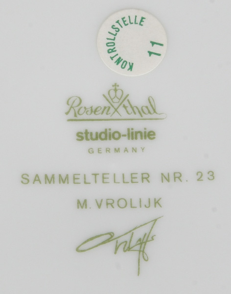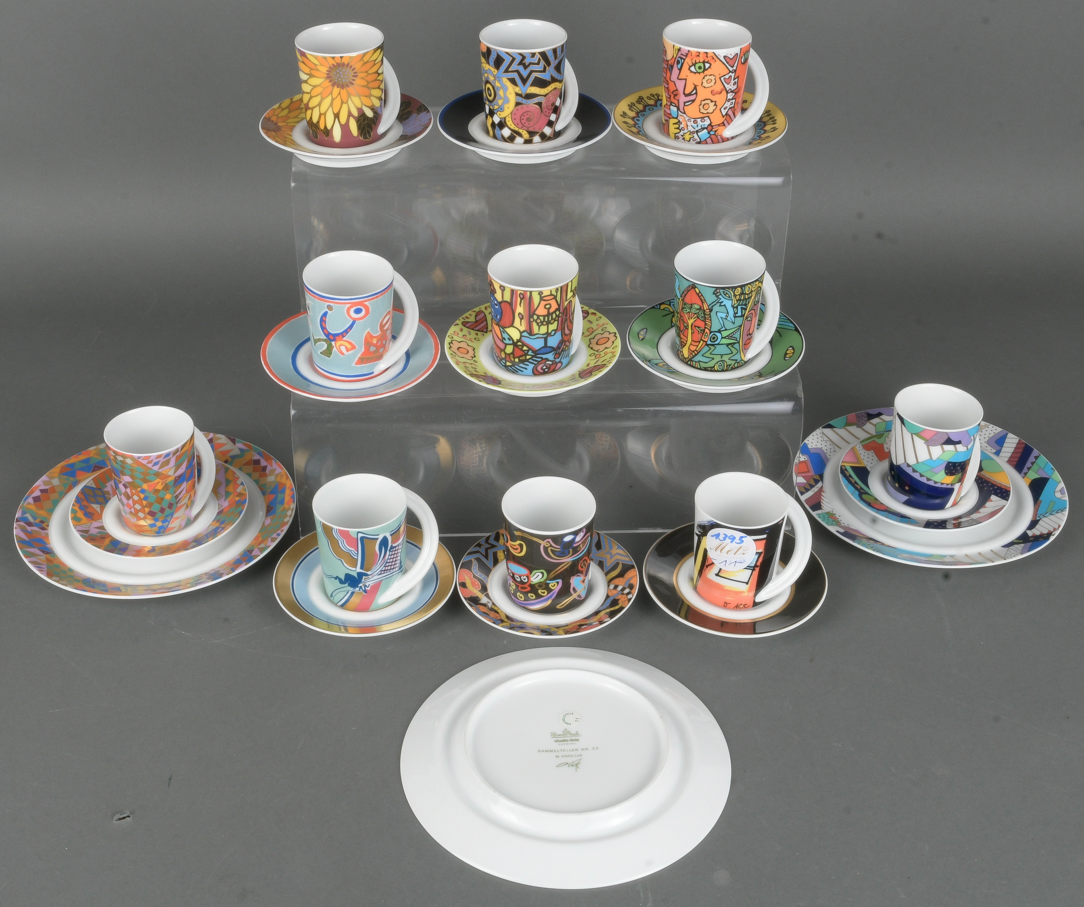 - Katalog-Nr: 1395Elf Espresso-Sammeltassen mit Unterschalen. Rosenthal 20. Jh. Porzellan, bunt bemalt; am Boden gemarkt, bez./sign. Nr. 1 J.C. de Crousaz, Nr. 2 B. Brenner, Nr. 4 B. Doege, Nr. 7 O. Alt, Nr. 8 James Rizzi, Nr. 15 G. Portanier, Nr. 20 Müller Behrendt, Nr. 22 Yong, Nr. 23 und 26 M.(aarten) Vrolijk, Nr. 36 Irene Wieland sowie drei Kuchenteller, Nr. 2, 4 und 23).o.L.