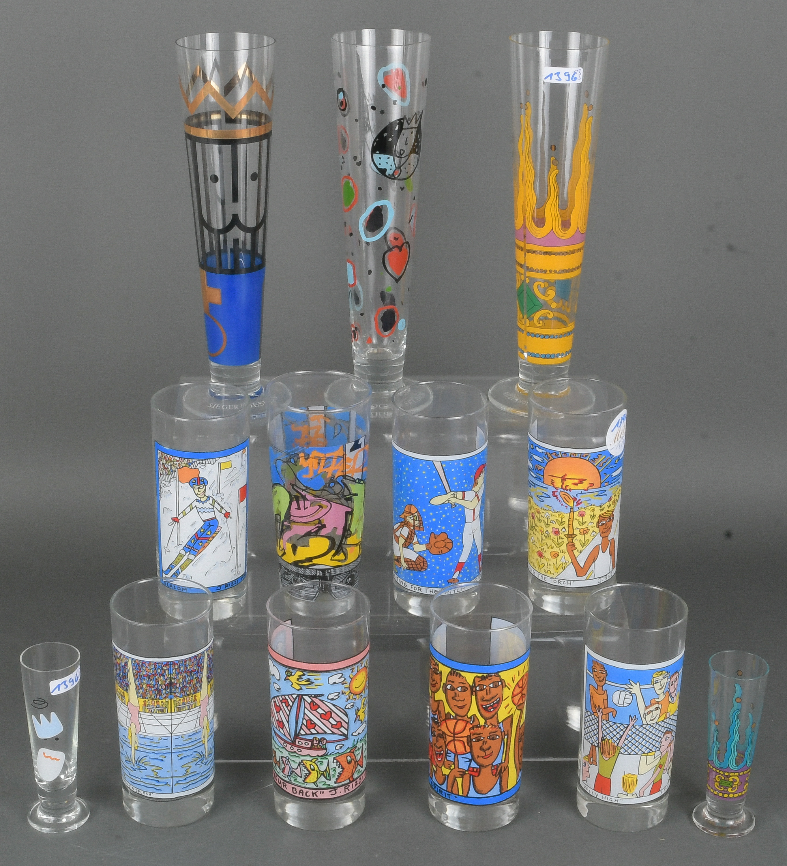 - Katalog-Nr: 139613 Designer-Gläser. Ritzenhoff 1990er Jahre. Bestehend aus: Sieben Longdrinkgläser von James Rizzi, u.a. „Team Spirit“ (1994), „Watch your Back“ (1995), „Vally High“ (1994), „Hardly A Splash“, drei Weizengläser von Roger Selden und Paolo Portoghesi sowie zwei Likörgläser, H=11 bis 24,5 cm.o.L.