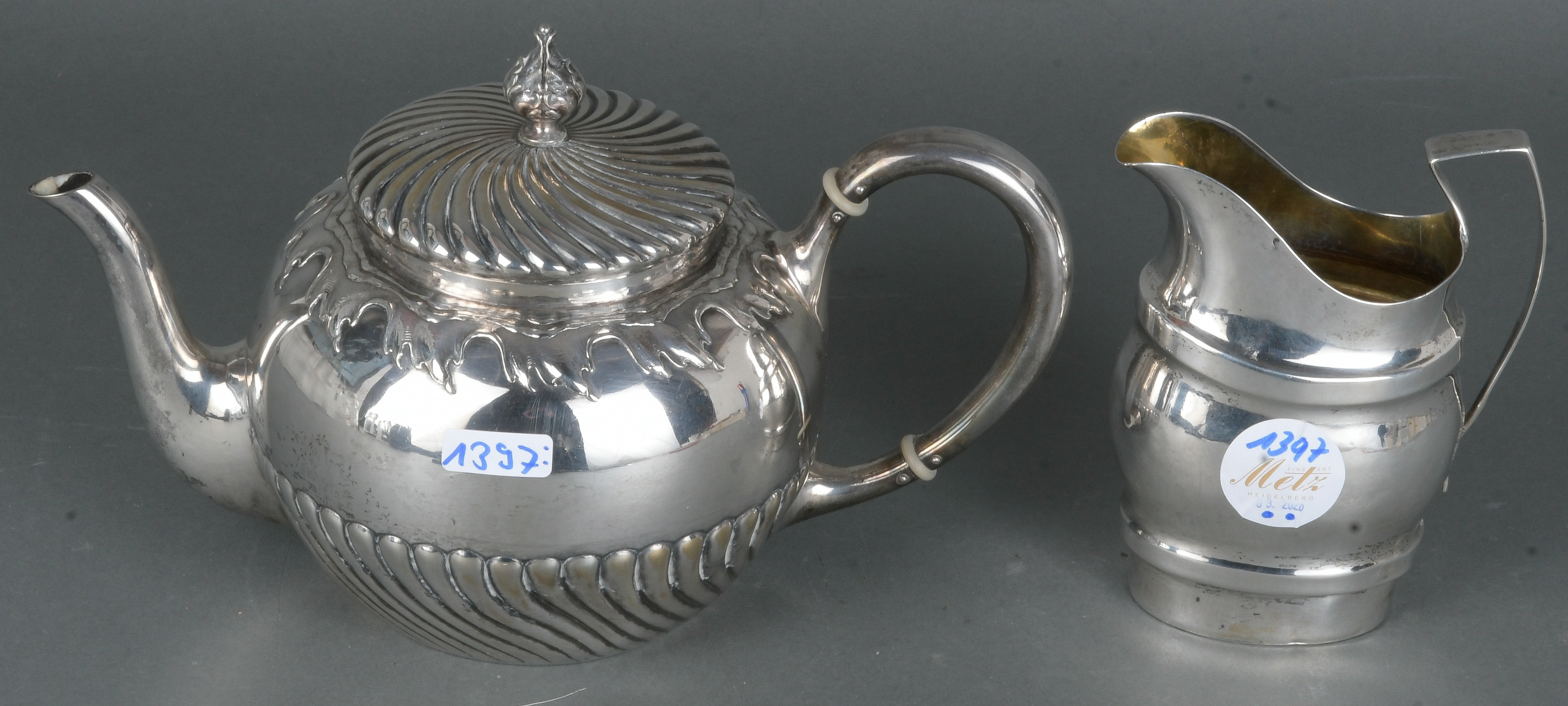 - Katalog-Nr: 1397Kanne und Milchgießer. Deutschland / Russland 20. Jh. 800er / 84er Silber, ca. 650 g, H=13 / 15 cm.o.L.