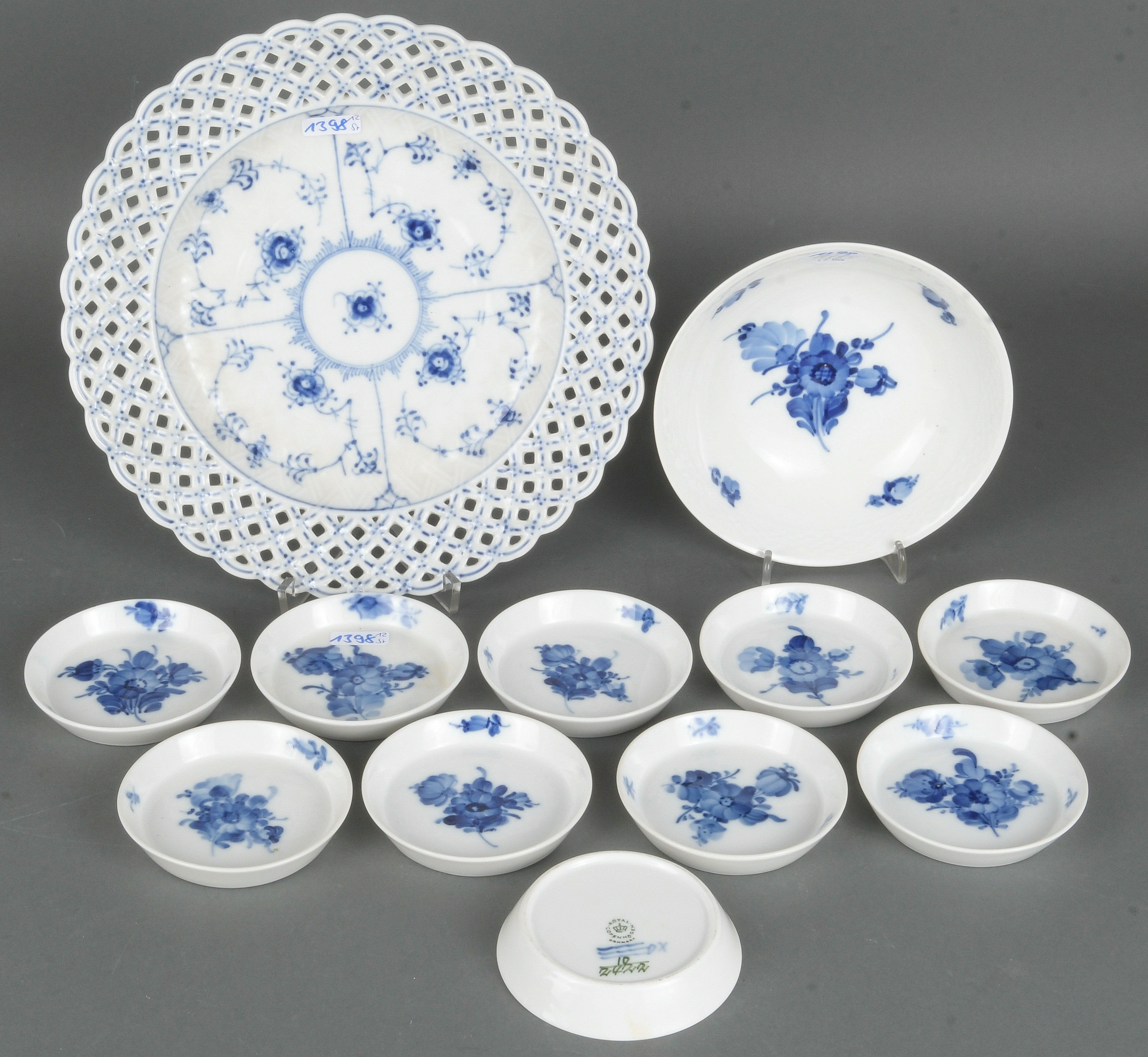 - Katalog-Nr: 1398Zwölftlgs. Konvolut Royal Copenhagen 20. Jh. Porzellan, unterglasurblau bemalt mit Floraldekor; am Boden gemarkt. Bestehend aus: Zehn Schalen (H=je 1,5 cm, D=je 9 cm), eine Schale (H=5 cm, D=16 cm) und ein Durchbruchsteller (D=26 cm).o.L.