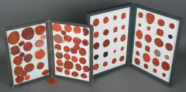 - Katalog-Nr: 1390Sammlung adeliger, klerikaler, bürgerlicher und amtlicher Siegel, u.a. „Ludw. Graf Sarnthein“, mit Kardinalshut, „Grossherzoglich Luxemburgische Hofcasse“, „Det Kongelig Skatt-Cammer“, in zwei OLN-Kladden mit ornamentaler Goldprägung.o.L.