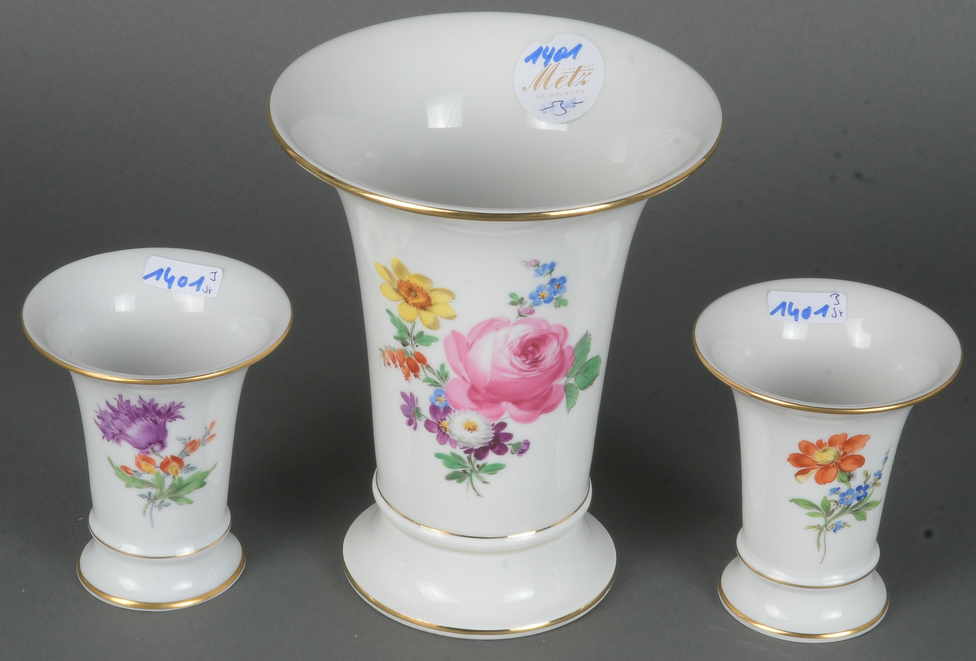 - Katalog-Nr: 1401Drei Vasen in Trompetenform. Meissen 20. Jh. Porzellan, bunt bemalt mit Floraldekor, Goldrand; am Boden unterglasurblaue Schwertermarke, H=9,5 bis 16,5 cm.o.L.