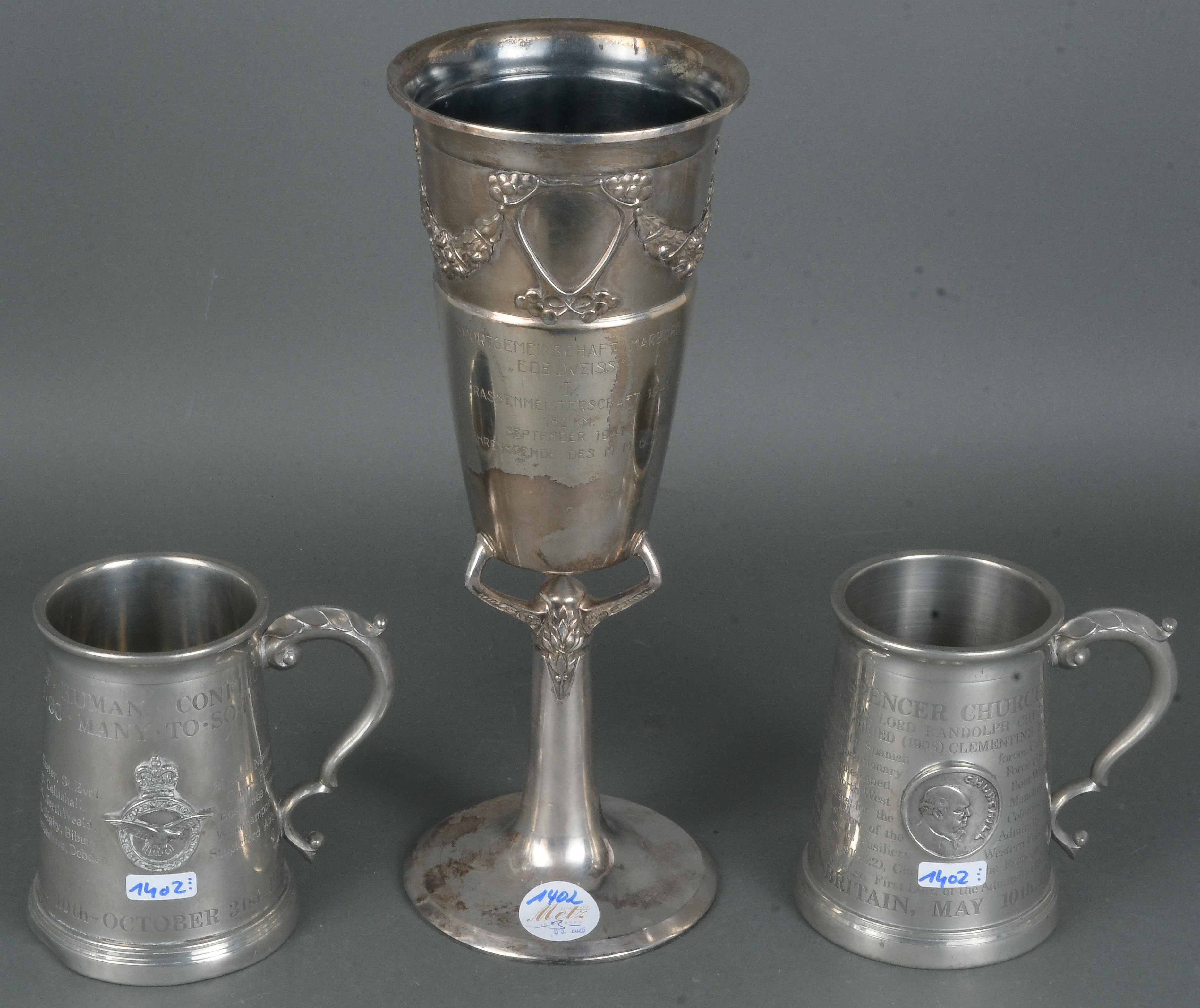 - Katalog-Nr: 1402Gedächtnispokal und zwei -humpen. Deutsch 1941 / England 1940. Zinn, reliefiert, ziseliert und beschriftet, H=32,5 / 13 cm.o.L.