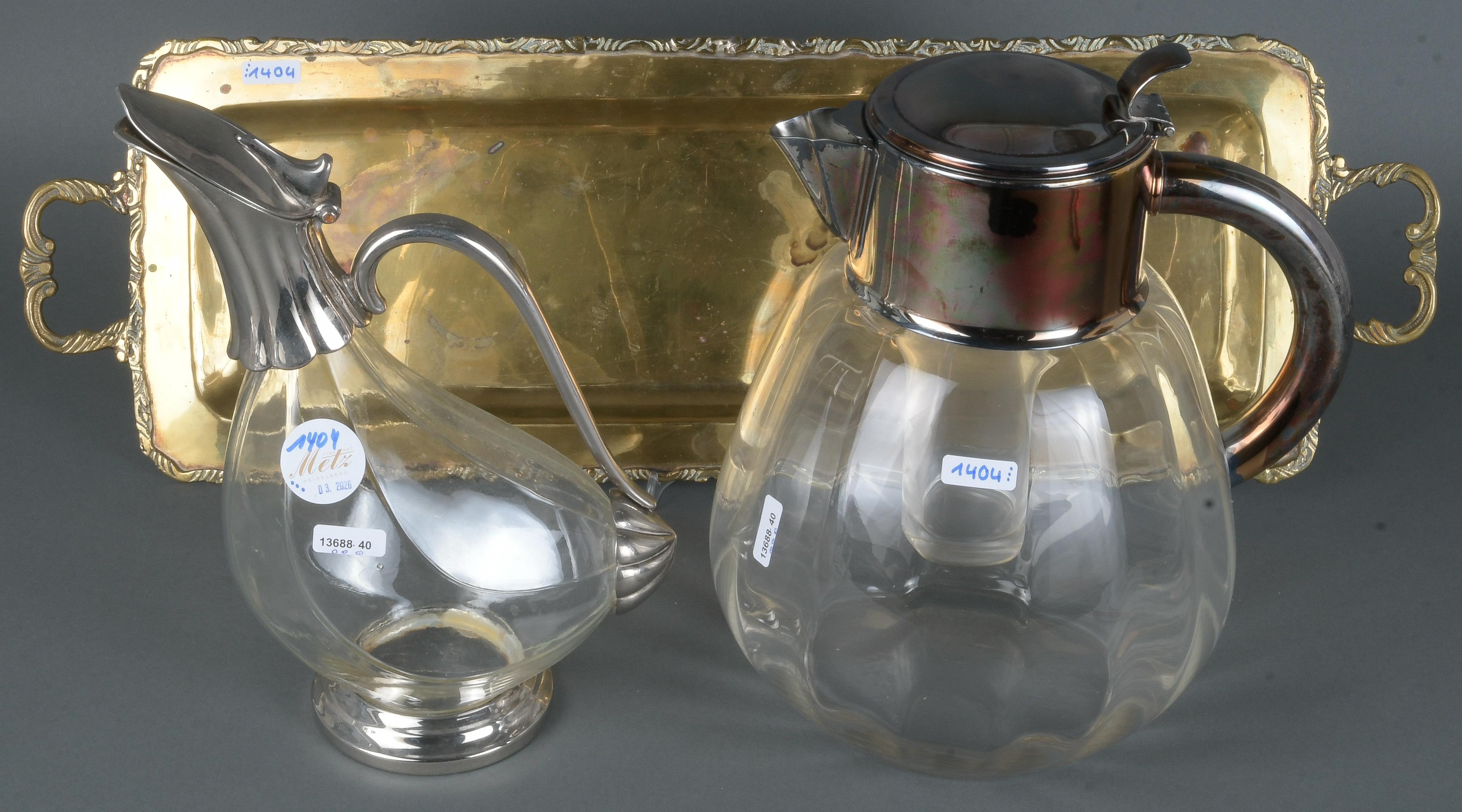 - Katalog-Nr: 1404Kalte-Ente-Kanne und Karaffe. Deutsch 20. Jh. Je Glas mit versilberter Montur (H=28 / 27 cm); dazu ein Messingtablett, 60 x 19,5 cm.o.L.