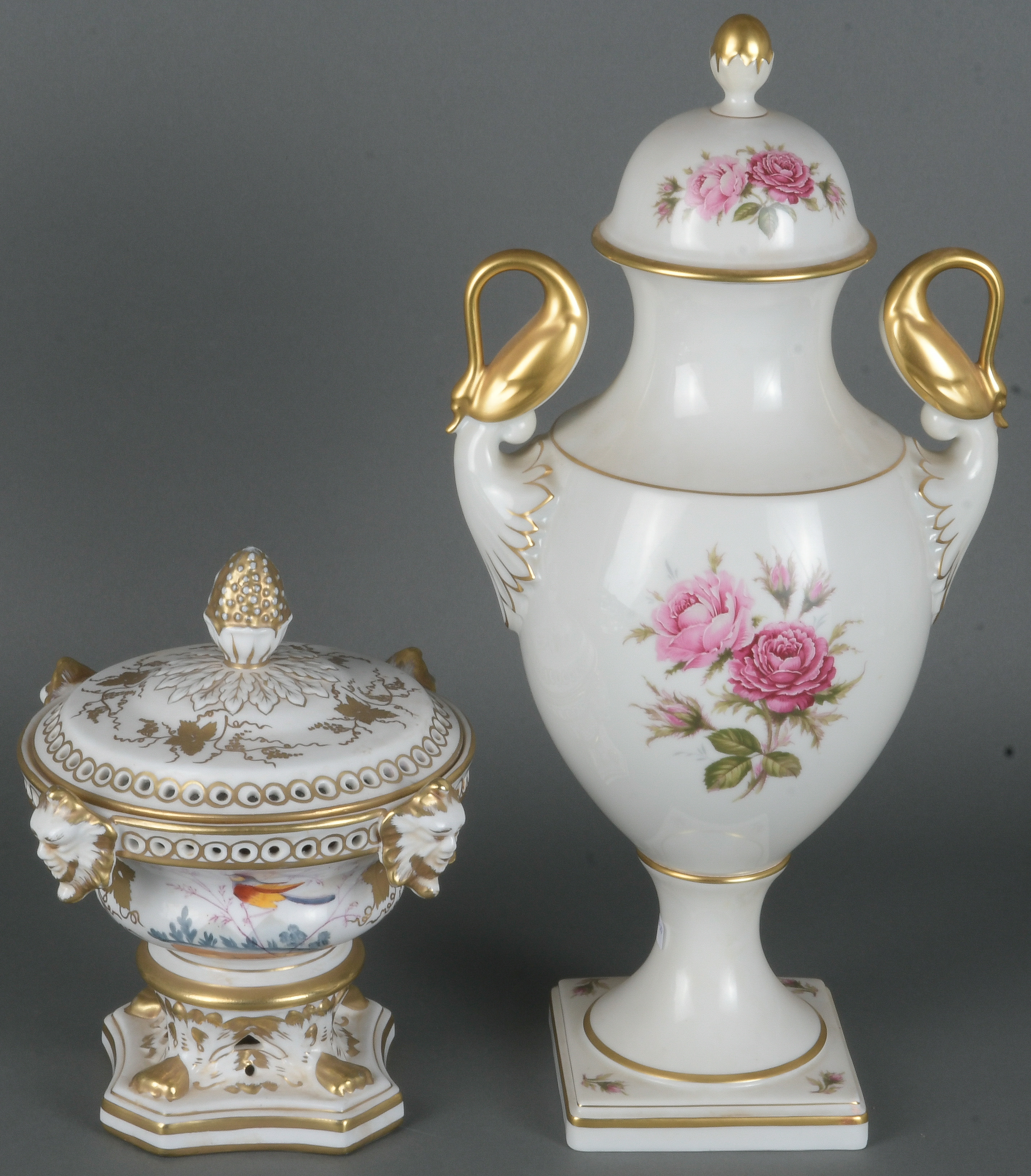 - Katalog-Nr: 1406Potpourrivase. Dresden 19. Jh. Porzellan, bunt bemalt mit Vogeldekor, reich gold dekoriert (H=21,5 cm, D=20 cm); dazu Doppelhenkelvase. Kaiser 20. Jh. Porzellan, bunt bemalt mit roter Rose; am Boden gemarkt, H=41 cm.o.L.