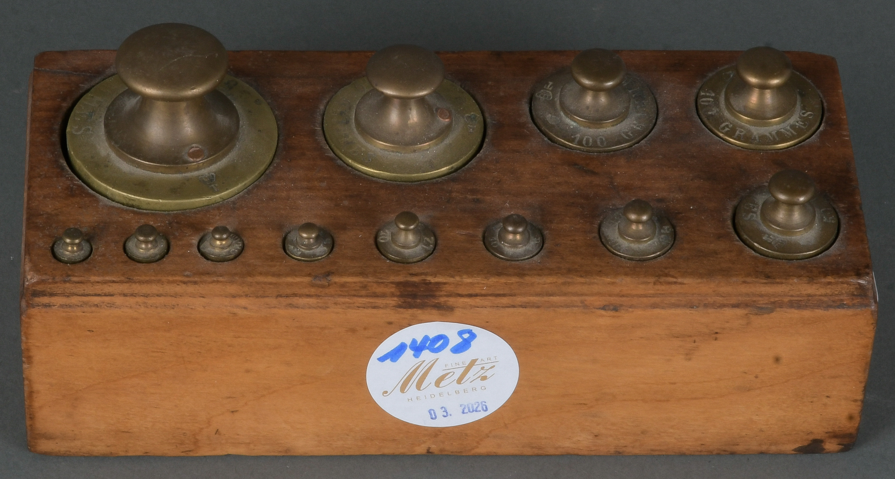 - Katalog-Nr: 1408Gewichtssatz. Deutsch 19./20. Jh. Massivholz, mit Bronzegewichten, H=7,5 cm, B=16,5 cm, T=6,5 cm.o.L.