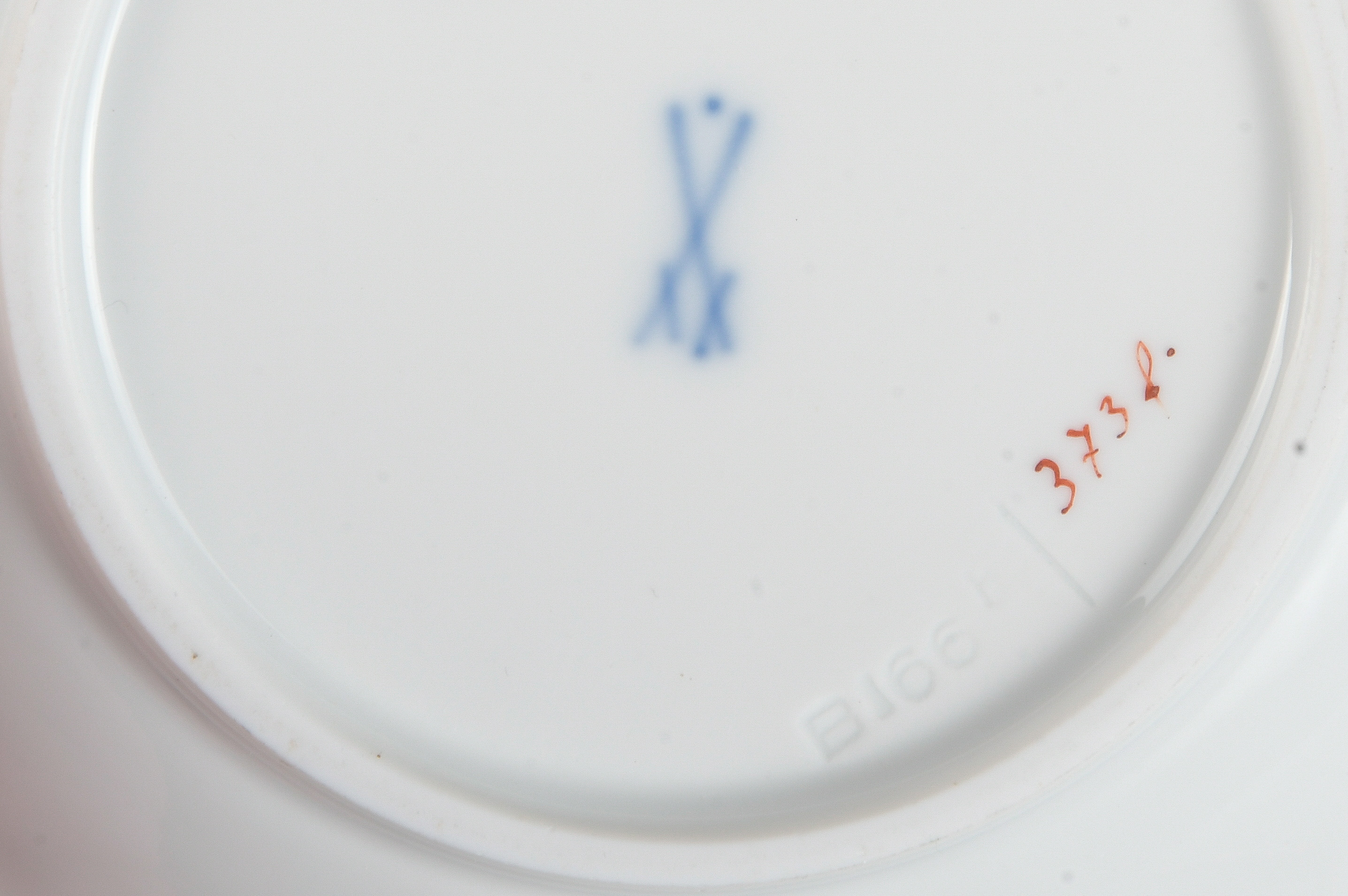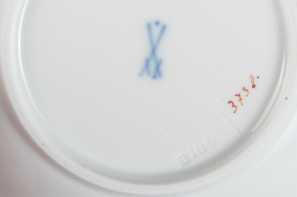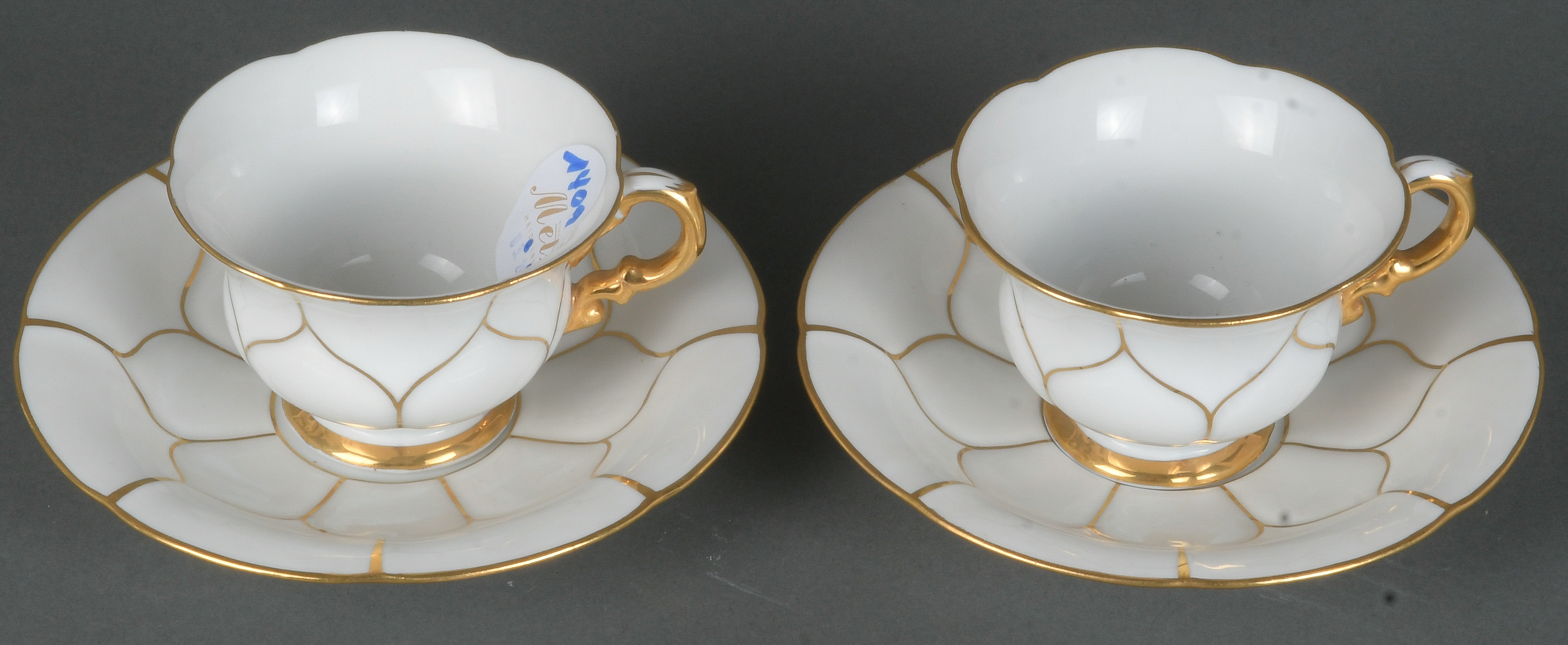 - Katalog-Nr: 1409Paar Mokkatassen mit Unterschalen. Meissen Pfeifferzeit 1924–34. Porzellan, weiß glasiert mit Golddekor; am Boden unterglasurblaue Schwertermarke.o.L.