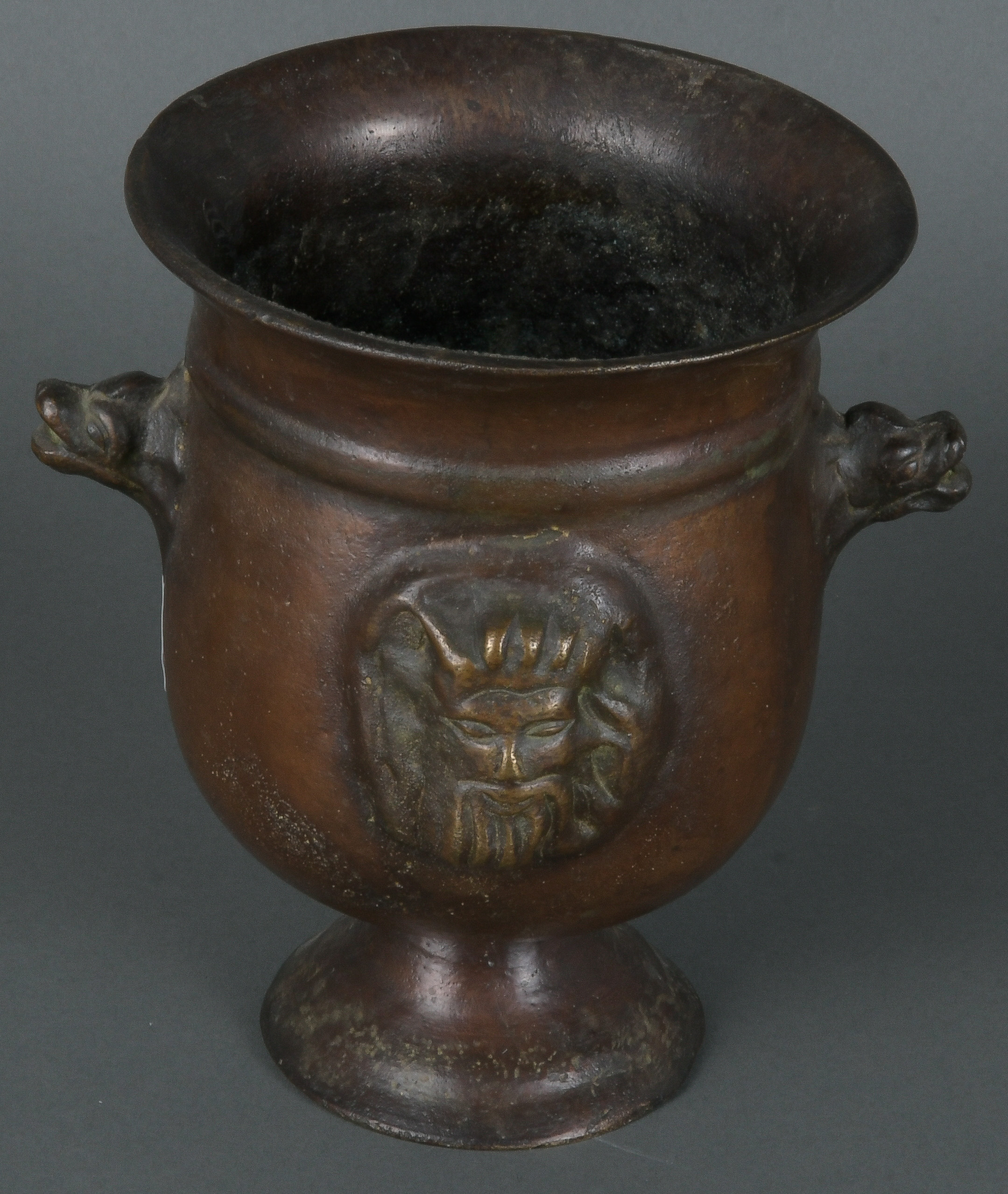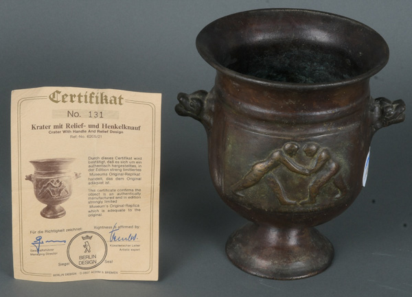 - Katalog-Nr: 1411Kratervase mit figürlichem Relief. Bronze-Museumsreplik mit Zertifikat „No. 131“, Berlin-Design, H=18,5 cm, D=14 cm.o.L.