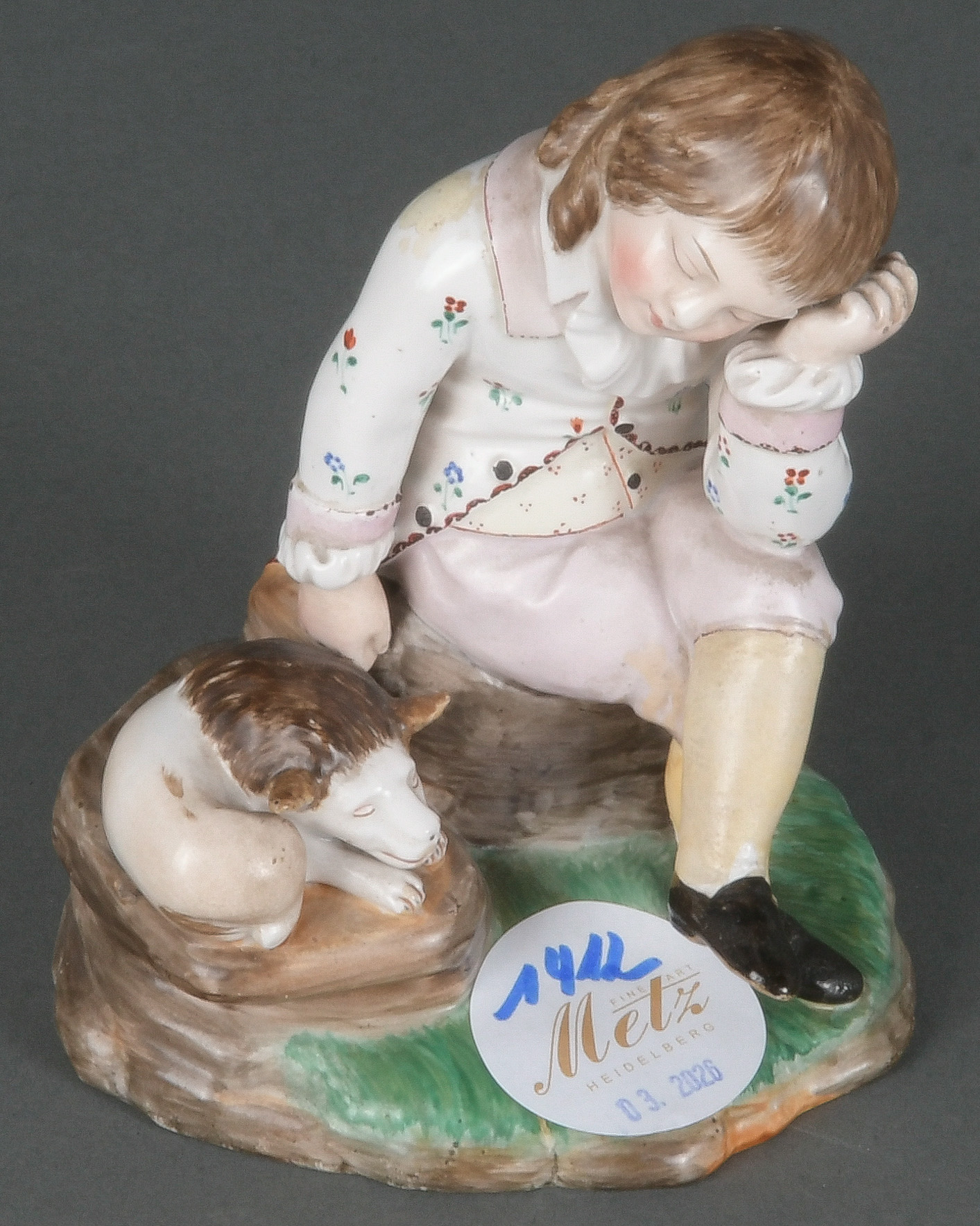 - Katalog-Nr: 1412Schlafender Junge mit Hund. Höchst-Damm 18. Jh. Feinsteinzeug, ohne Marke, am Boden Ritzzeichen „172“, Modell nach Carl Ries, H=11,5 cm. (rest.)o.L.