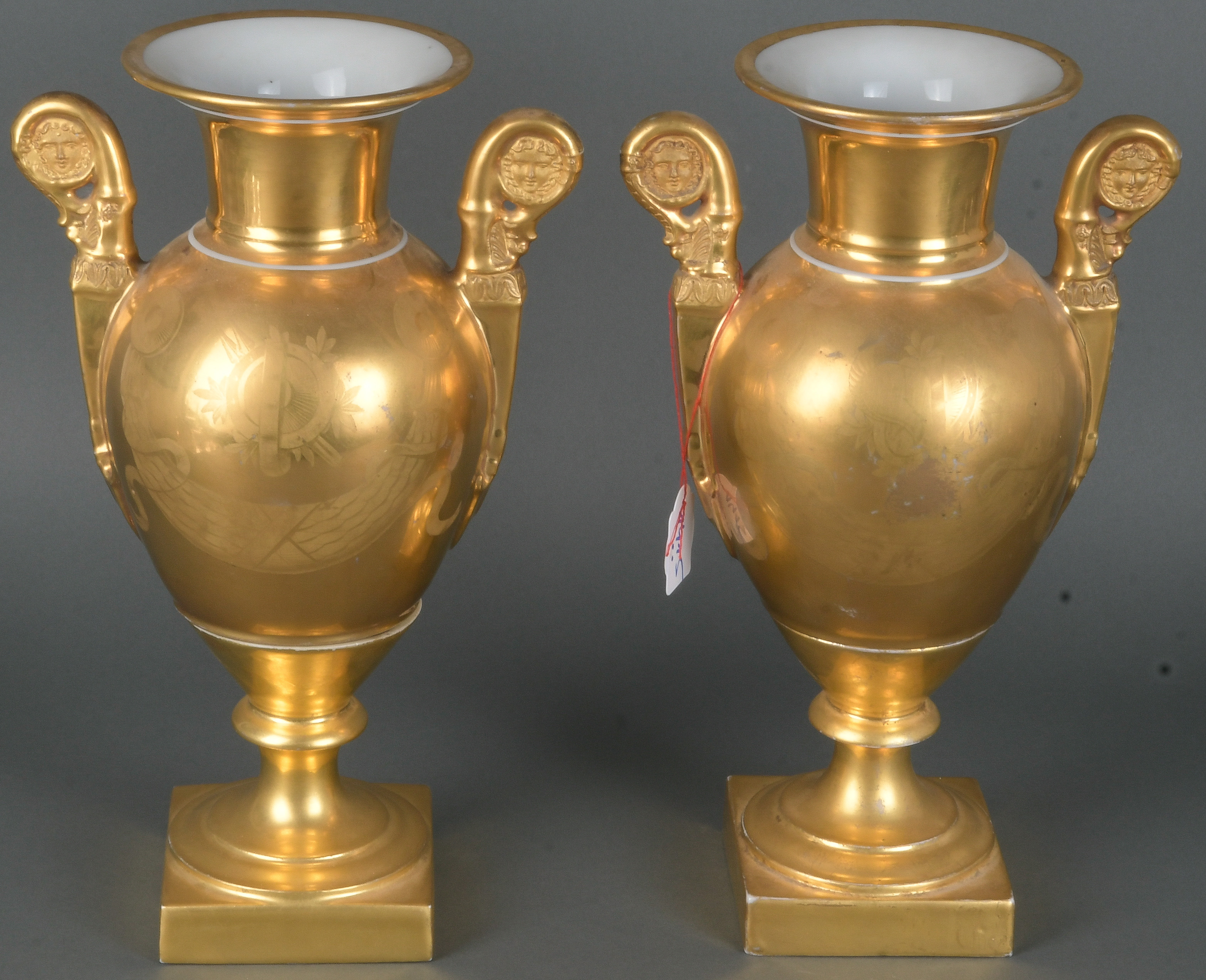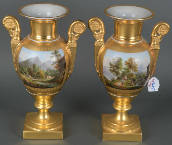 - Katalog-Nr: 1415Paar Doppelhenkelvasen. Frankreich 19. Jh. Porzellan, fein bunt bemalt mit detailreichen Landschaften in Reserven, reich gold staffiert, teilw. radiert; eine am Boden bez. „Deroche“, H=je 32 cm.o.L.