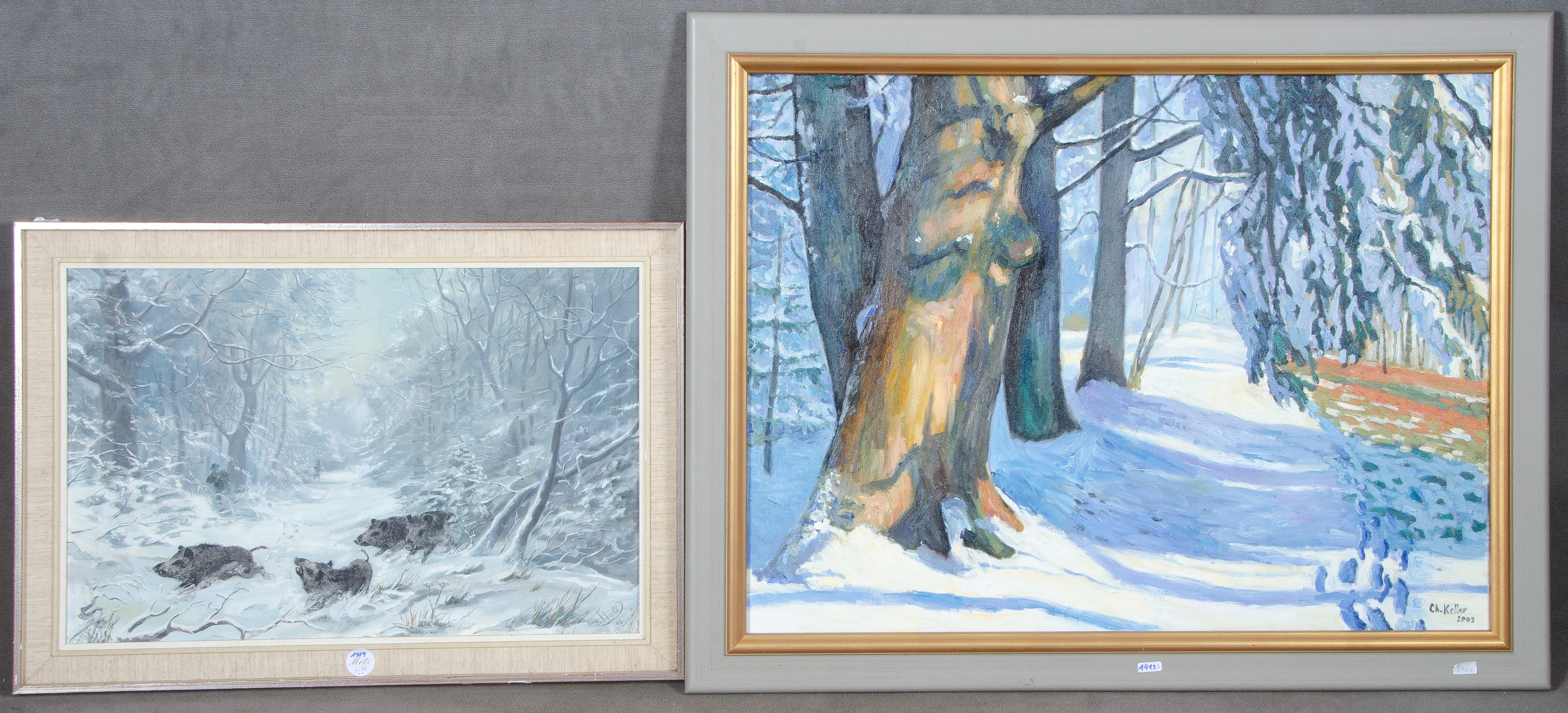 - Katalog-Nr: 1419Ch. Keller (Maler des 20./21. Jhs.). Winterlandschaft mit Bäumen. Öl/Lw., re./u./sign./dat. 2003; dazu F. Stoll (Maler des 20. Jhs.). Saujagd. Öl/Malkarton, re./u./sign./dat. (19)68, gerahm, 39 x 59 / 59 x 79 cm.o.L.