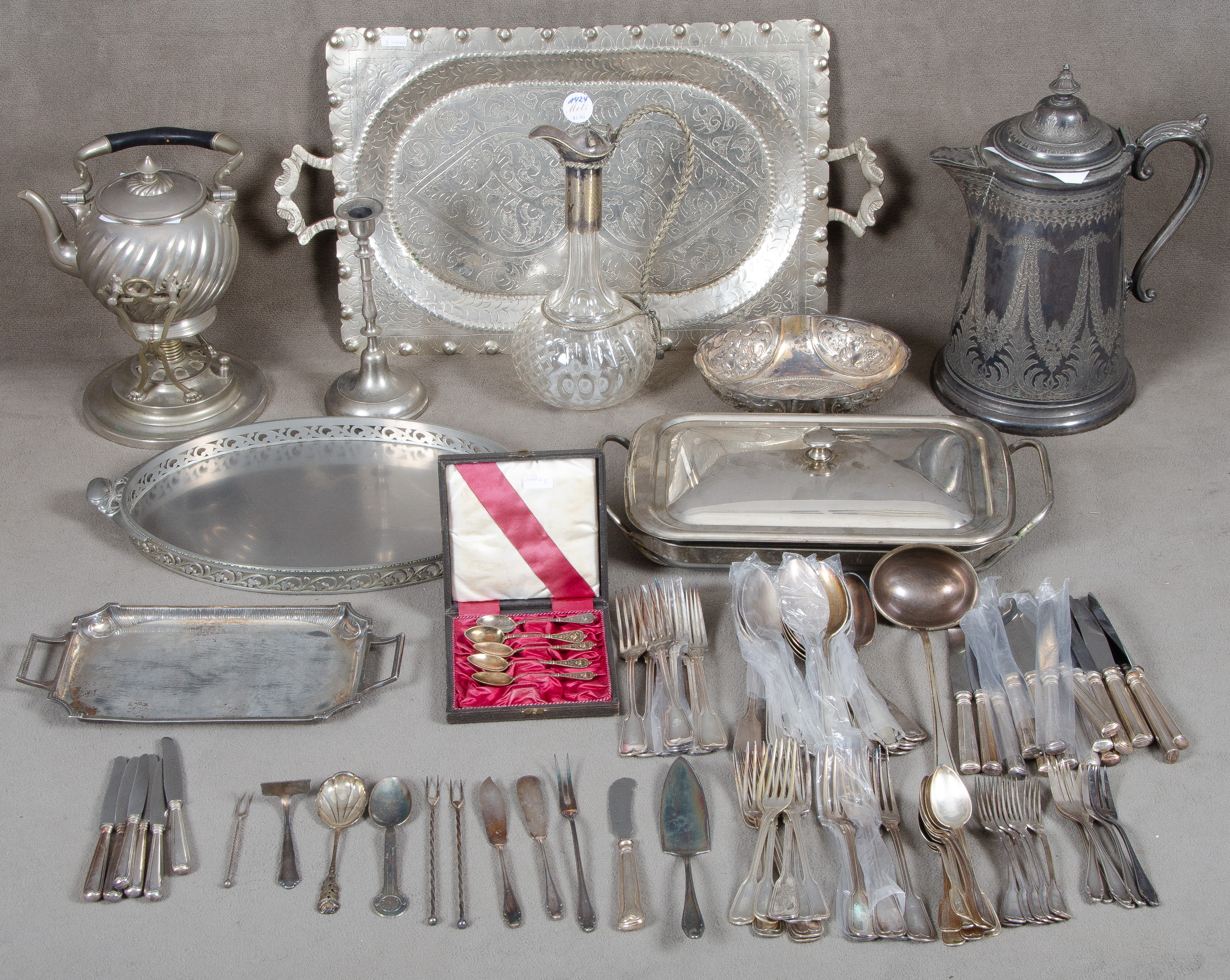 - Katalog-Nr: 1424Konvolut Versilbertes und Zinn. Deutsch 20. Jh. Bestehend aus: Div. Besteckteile, Kannen, Karaffen, Kasserole, Kerzenleuchter, Schalen und Tabletts, H=2,5 bis 37 cm.o.L.