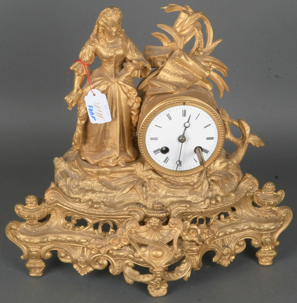 - Katalog-Nr: 1403Kaminuhr. Frankreich 19. Jh. Spritzguss, goldfarben gefasst, mit stehender, weiblicher Figur, ein Pergament und Feder in den Händen haltend; Uhrwerk mit doppeltem Schlüsselaufzug, H=31 cm, B=32,5 cm, T=15 cm. (Schlüssel vorhanden / Funktion ungeprüft)o.L.