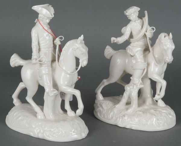 - Katalog-Nr: 1405Paar Kurpfälzische Reiter. Nymphenburg 1971. Porzellan, weiß glasiert, am Boden eingepresste Rautenschildmarke, Pressziffer „1067a“ bzw. „1063“ und unterglasurblaue, bekrönte CT-Marke mit Ziffer „1971“, H=17,1 / 17,7 cm.o.L.