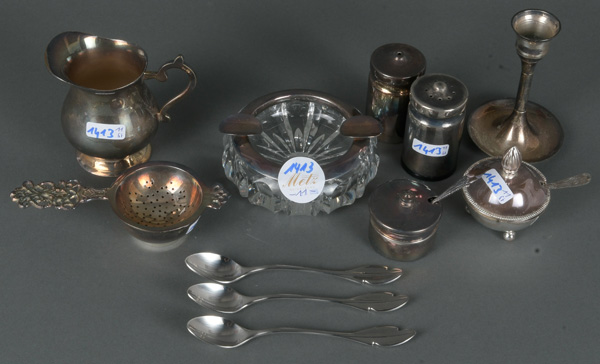 - Katalog-Nr: 1413Zehntlgs. Konvolut Versilbertes u.a. Kerzenständer, Löffel, Milchgießer, Salz- und Pfefferstreuer und Teesieb (H=3 bis 10,5 cm); dazu Kristallglas-Aschenbecher mit 835er Silbermontur, D=10,5 cm.o.L.