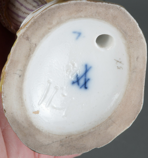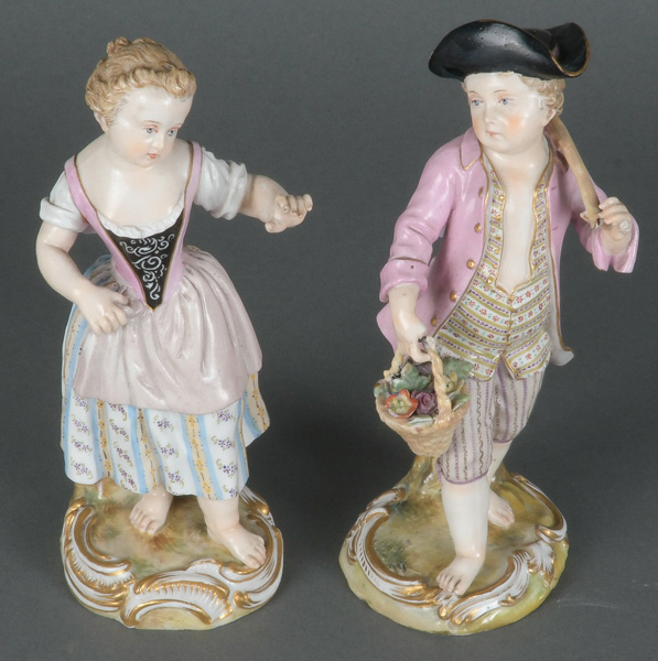 - Katalog-Nr: 1416Gärtner und Gärtnerin. Meissen 19. Jh. Porzellan, bunt bemalt; am Boden unterglasurblaue Schwertermarke, Modelle nach Johann Joachim Kaendler, H=14 / 14,2 cm. (zwei Finger des Knaben fehlen)o.L.