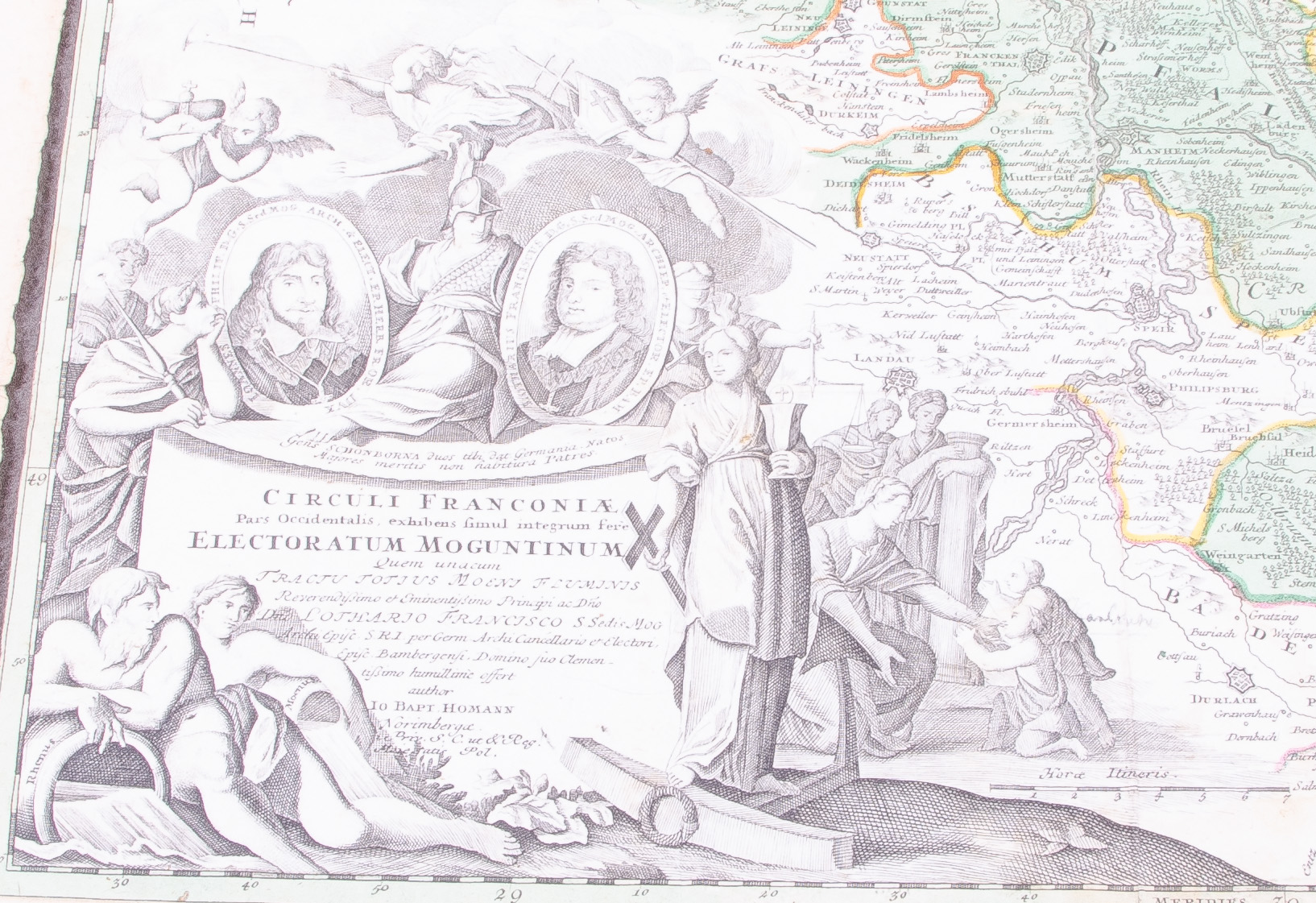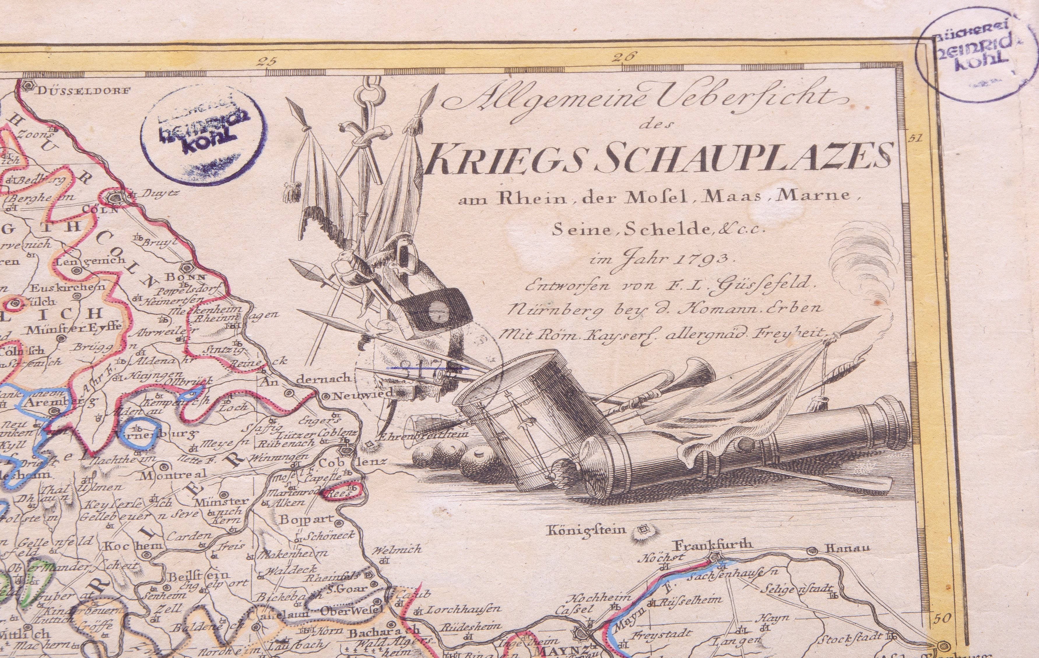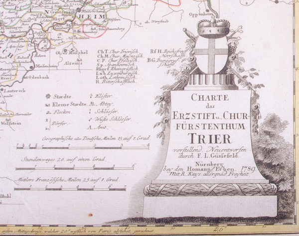 - Katalog-Nr: 1451Johann Baptista Homann (1664-1724) / Franz Ludwig Güssefeld (1744-1808) / Homann'sche Erben u.a. Neun Karten (eine in vier Teilen): Königreich Bayern, Franken, westphälischer Kreis, niedersächsischer Reichskreis, oberrheinischer Kreis, Fürstentum Trier, Rheingebiet, Rhein, Maas und Mosel, Ostsee. Colorierte Kupferstiche, teilw. mit Wappenkartusche, teilw. sign./dat., 46 x 49 bis 55 x 94 cm.o.L.