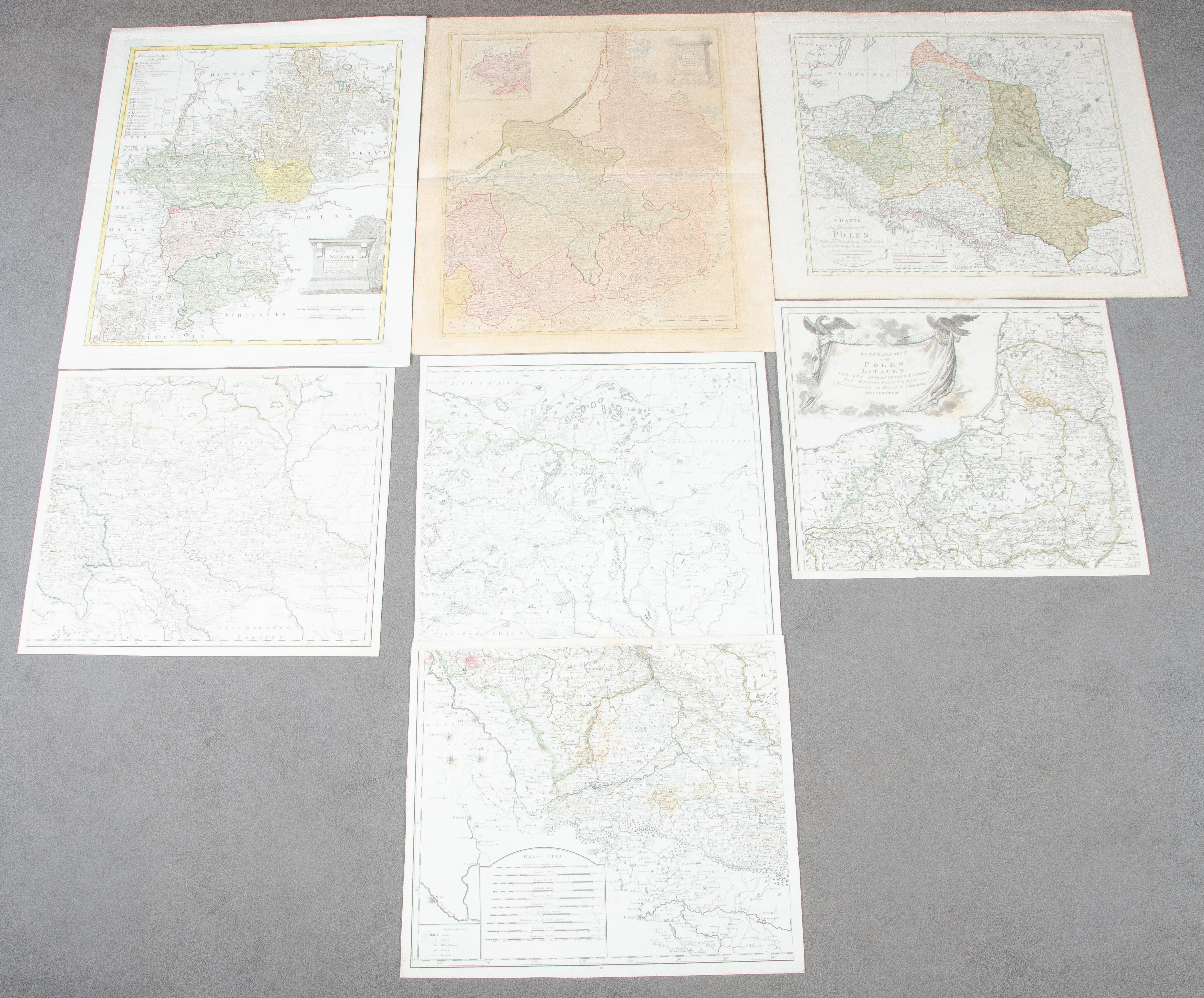 - Katalog-Nr: 1453Franz Ludwig Güssefeld (1744-1808) / Homann'sche Erben u.a. Sieben Karten, u.a. Baltikum, Litauen, Königreich Polen, Neumarck und Ukraine. Colorierte Kupferstiche, teilw. sign./dat., 47 x 56 bis 41 x 48 cm.o.L.