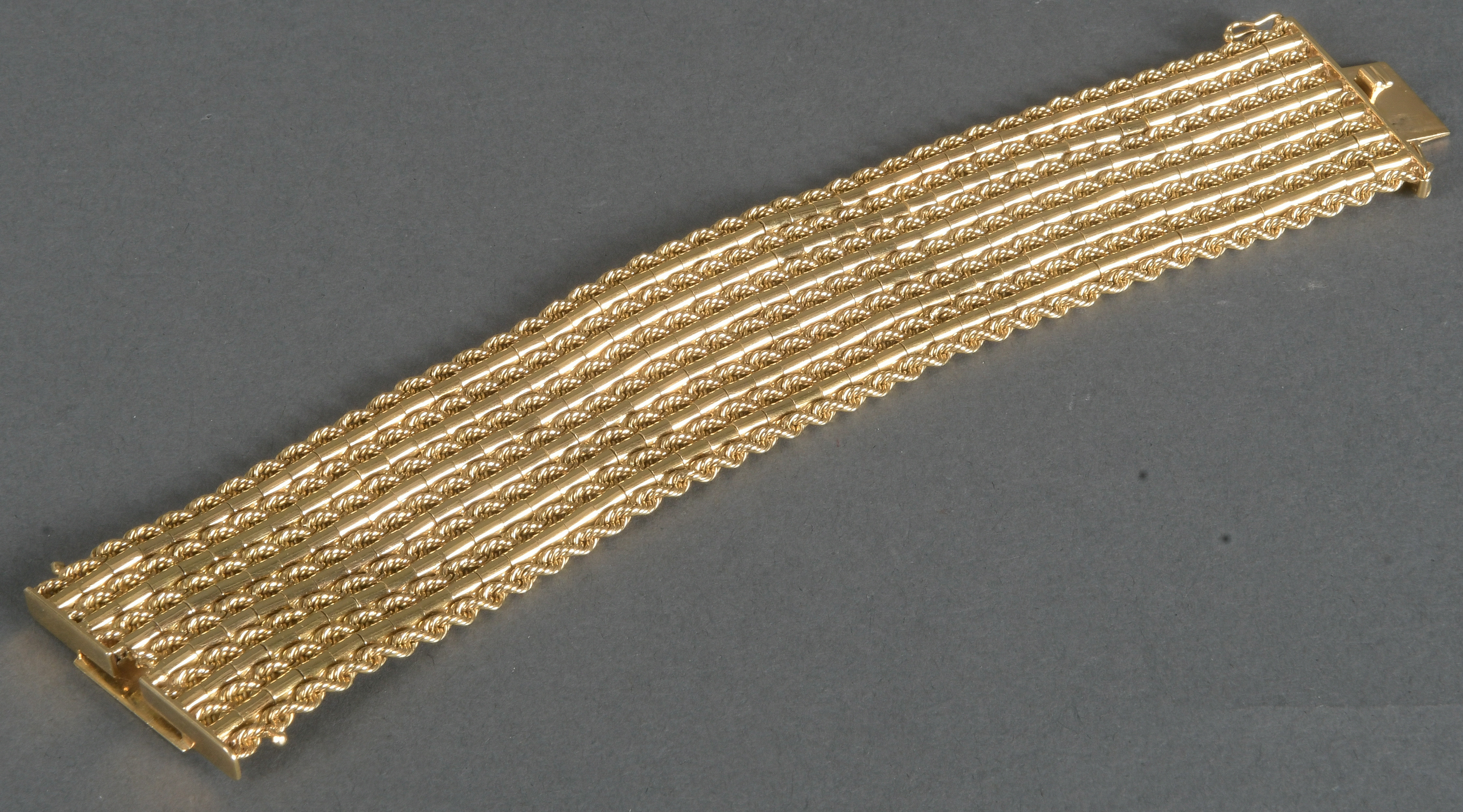 - Katalog-Nr: 1470Breites Armband. 18 kt Gold, ca. 118,3 g, 3,7 x 19 cm.o.L.