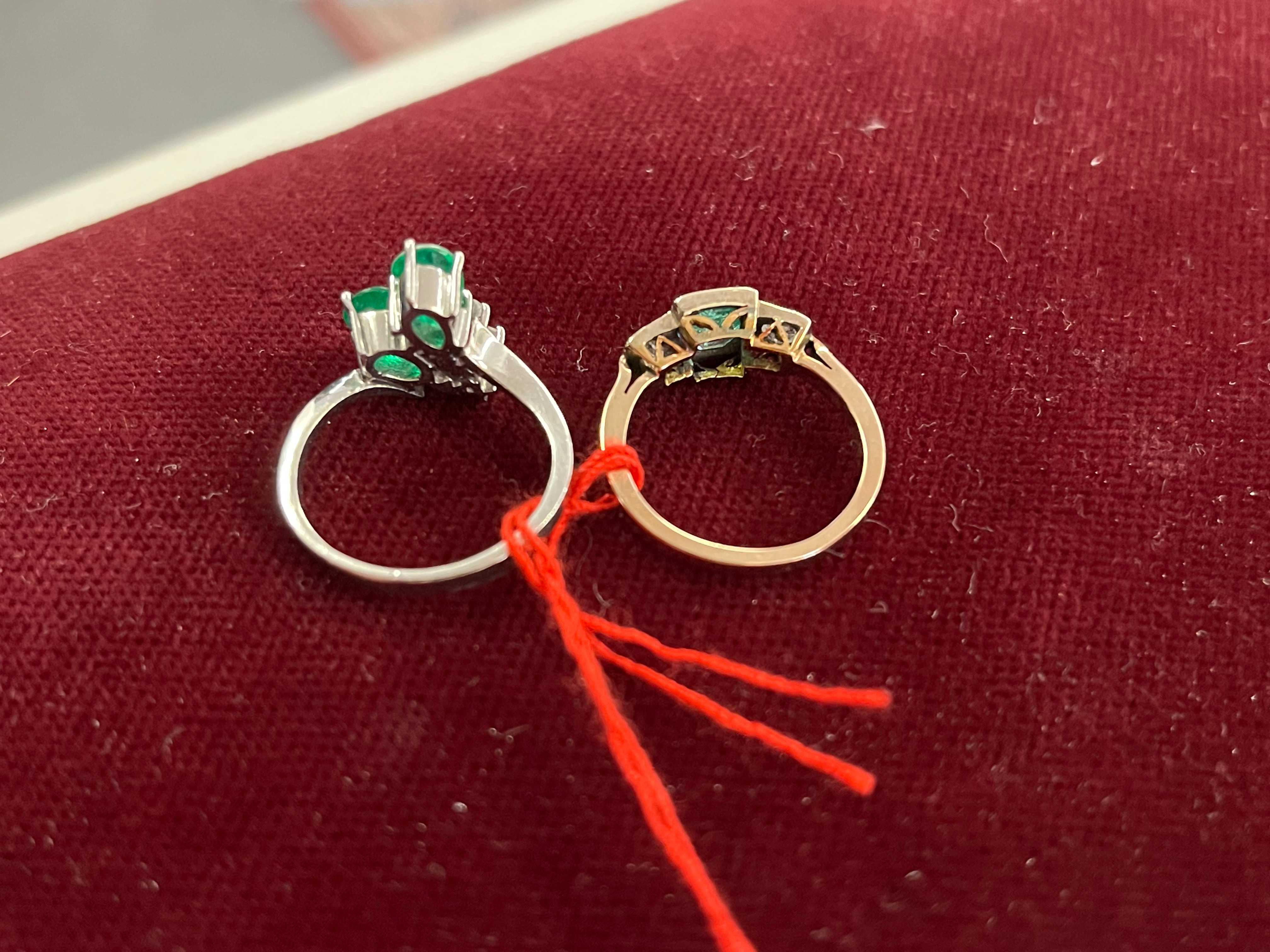 - Katalog-Nr: 1471Zwei Damenringe: 14 kt Gold, besetzt mit zwei Smaragddoubletten und drei Brillanten, ca. 0,08 ct, Gesamtgewicht ca. 3,2 g, Ringgröße 51; 18 kt Gold, besetzt mit einem Smaragd und zwei Brillanten, ca. 0,20 ct, Gesamtgewicht 2,7 g, Ringgröße 49. Die Begutachtungen der verarbeiteten Edelsteine und Diamanten wurden im gefassten Zustand vorgenommen, d.h. unter Vorbehalt einer sachgerechten Graduierung, die nur an ungefassten Steinen erfolgen kann. Dies hat zur Folge, dass die Gewichte (sog. "berechnete Gewichte", d.h. ca.+/- 10 % Abweichung) und Qualitäten (Farbe, Reinheit und Schliff) der Steine nur annähernd angegeben werden können.o.L.
