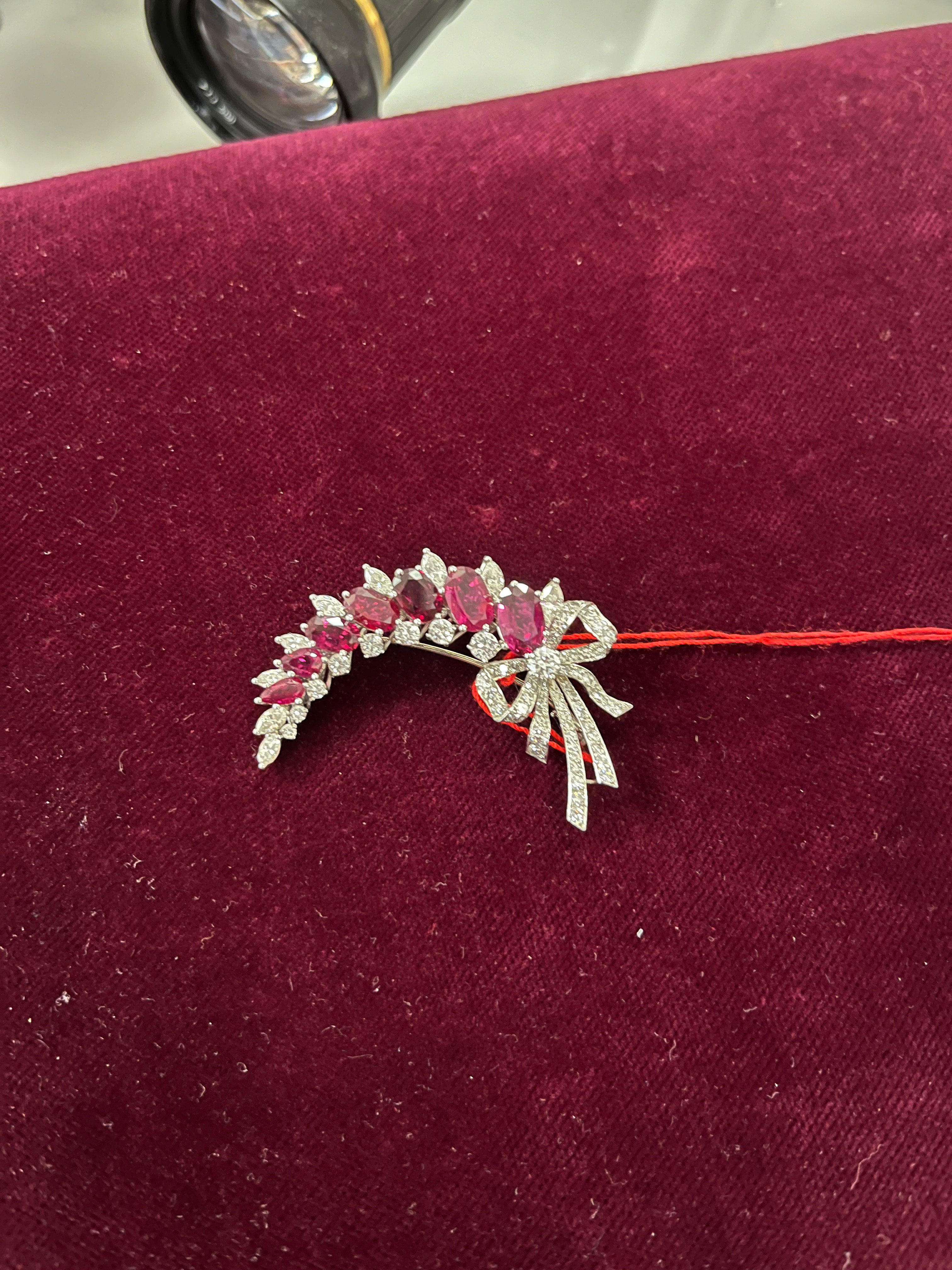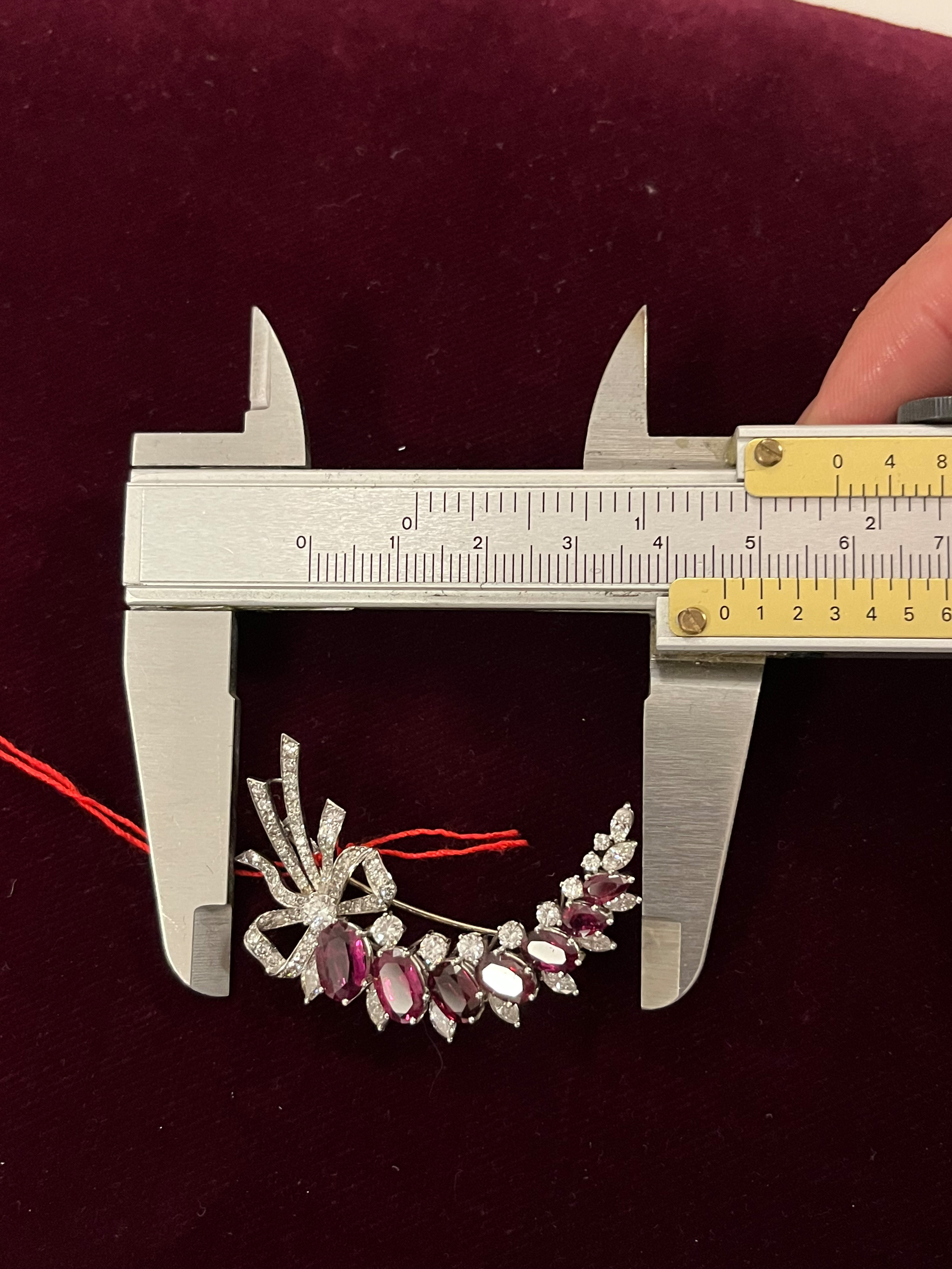 - Katalog-Nr: 1475Brosche. Platin, besetzt mit sieben Rubinen und Diamanten, ca. 1,7 ct, Gesamtgewicht ca. 12,4 g. Die Begutachtungen der verarbeiteten Edelsteine und Diamanten wurden im gefassten Zustand vorgenommen, d.h. unter Vorbehalt einer sachgerechten Graduierung, die nur an ungefassten Steinen erfolgen kann. Dies hat zur Folge, dass die Gewichte (sog. "berechnete Gewichte", d.h. ca.+/- 10 % Abweichung) und Qualitäten (Farbe, Reinheit und Schliff) der Steine nur annähernd angegeben werden können.o.L.